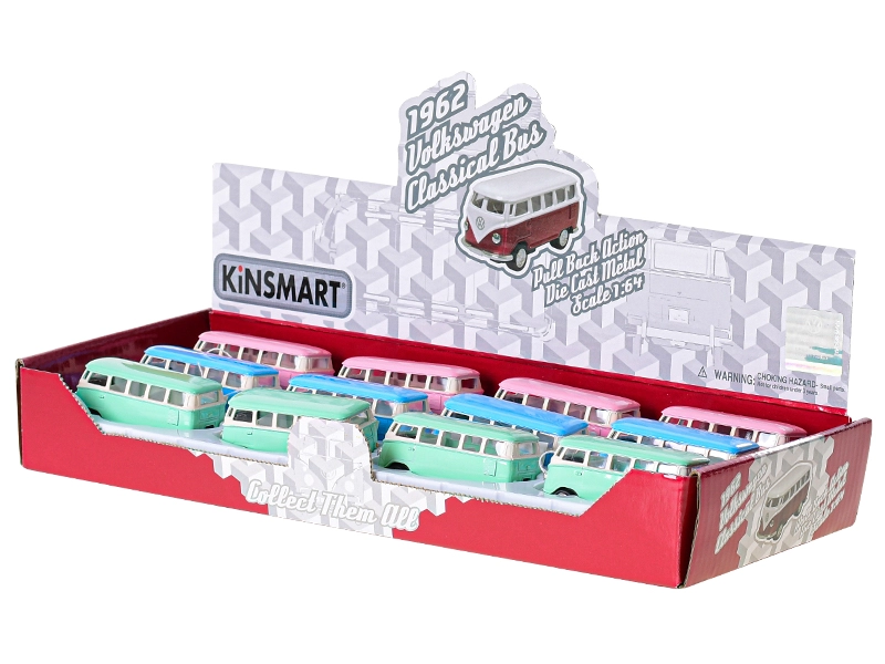 Részletesen kidolgozott fém modell az ikonikus Volkswagen Bus 1962 autóból 1:64 méretarányban, amely örömet szerez gyűjtőknek és gyerekeknek egyaránt. Kínál realista dizájnt, hátrahúzós meghajtást az önálló haladáshoz és nyitható ajtókat. A fém és műanyag kombinációjának köszönhetően tartós és könnyű, 7 cm hosszú, három színváltozatban. 3 éves kortól ajánlott.
