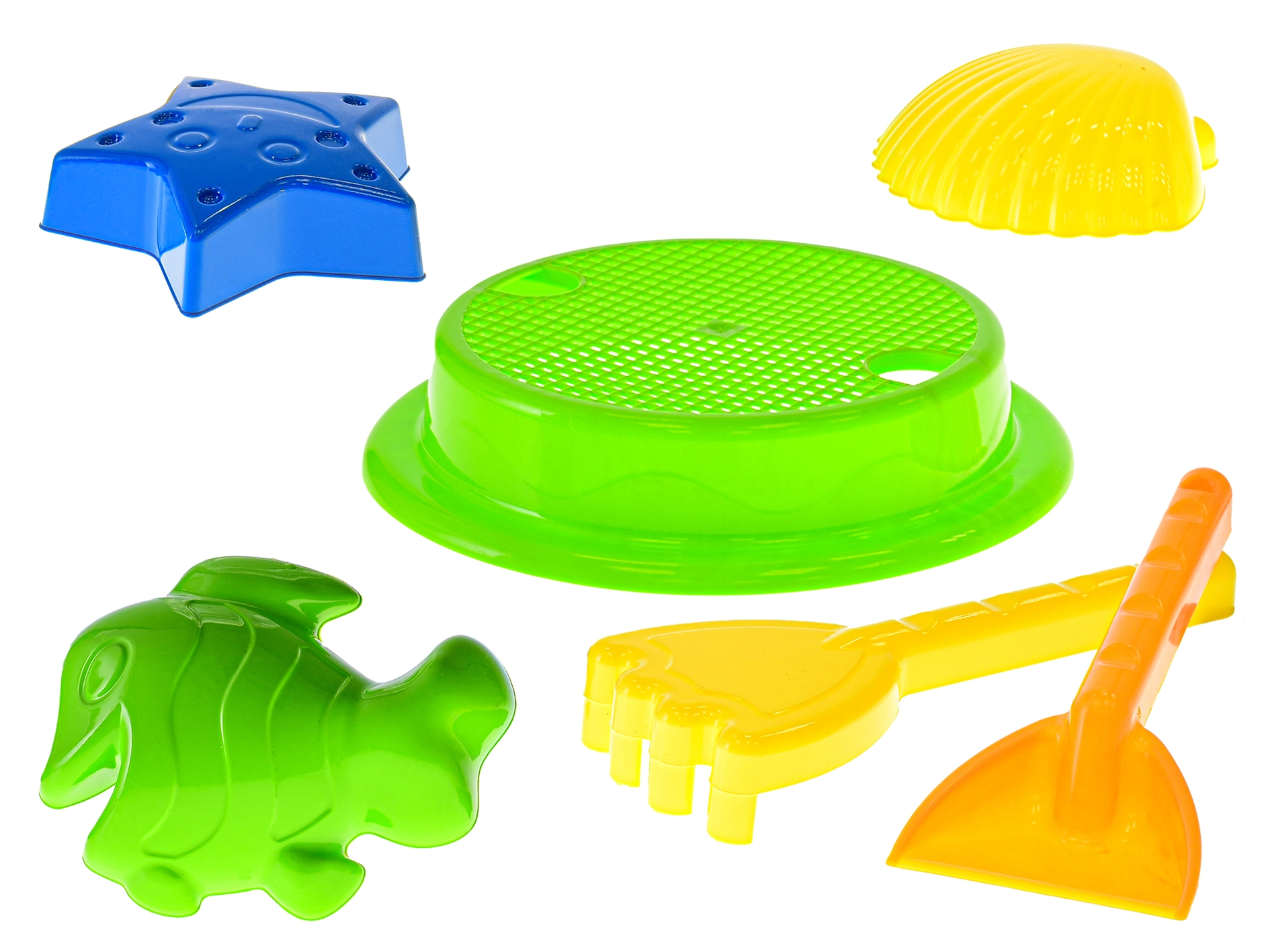 A csomag tartalma: szűrő a homok átszitálásához, lapát és gereblye az ásáshoz és formázáshoz, valamint 3 forma (halacska, teknős, kagyló vagy csillag) a gyönyörű homokalkotásokhoz.