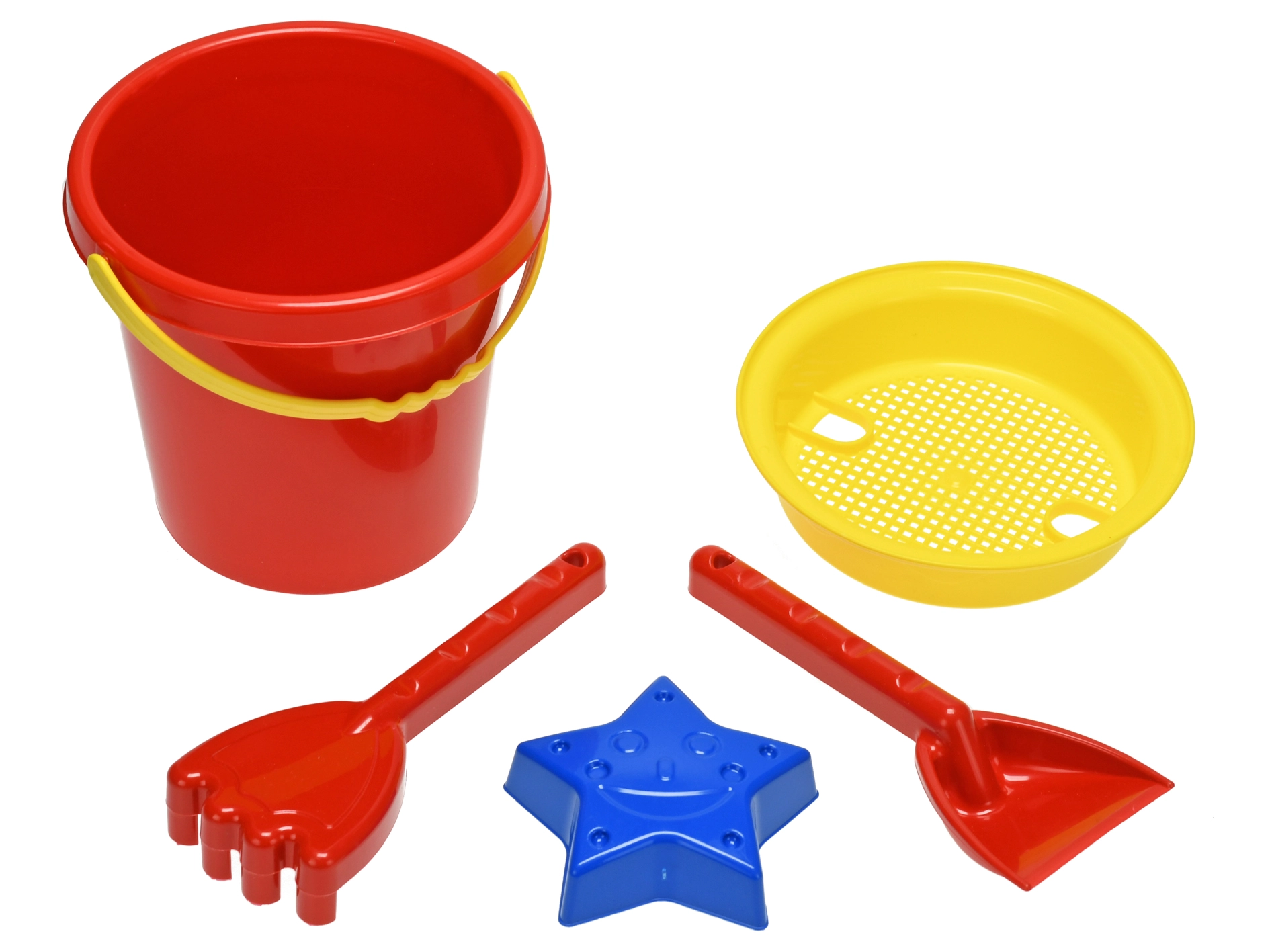 Komplett készlet alap eszközökkel – 17 cm-es vödör, szita, lapát, gereblye és forma – kész a homokozóhoz és a strandra.