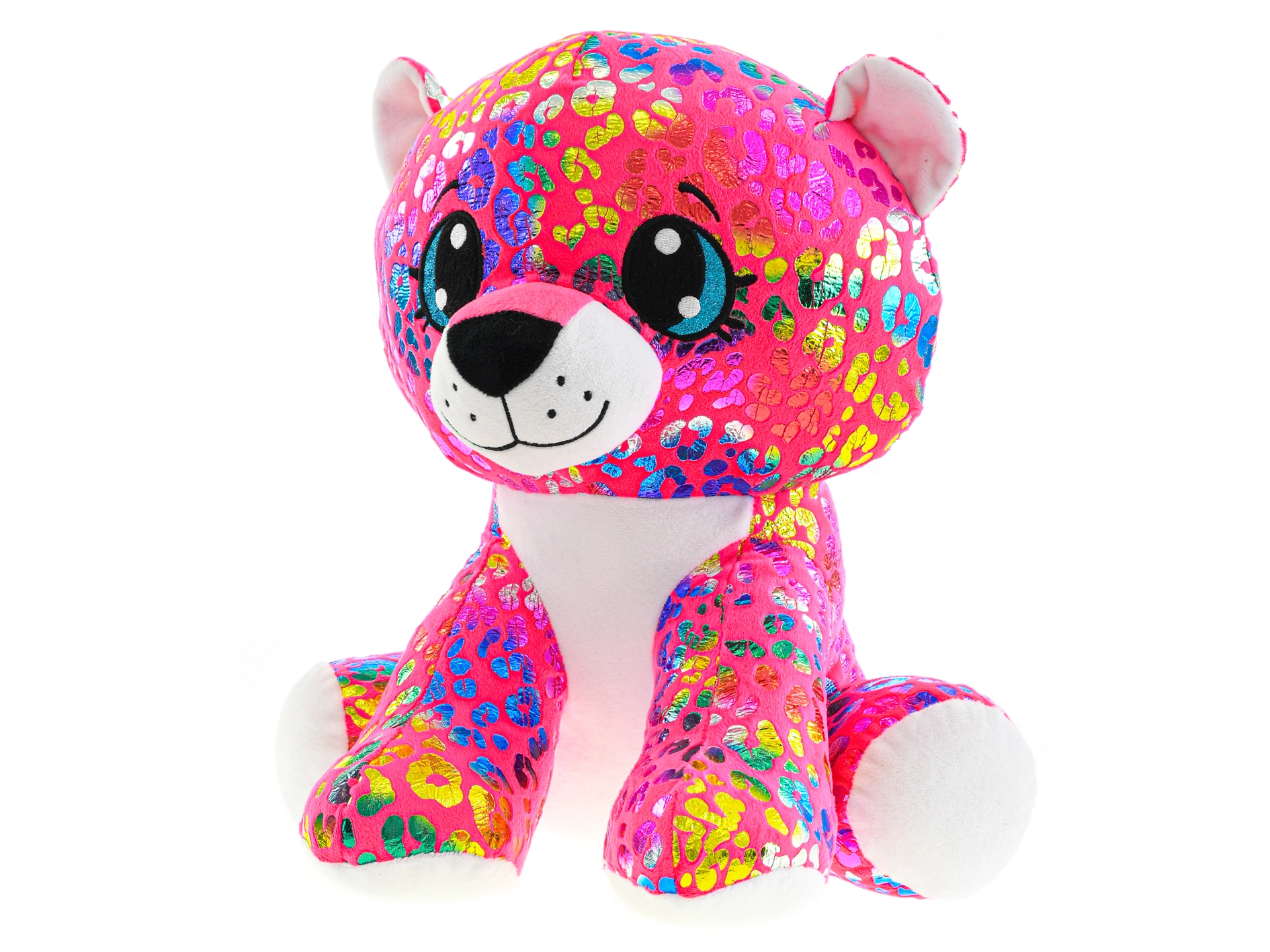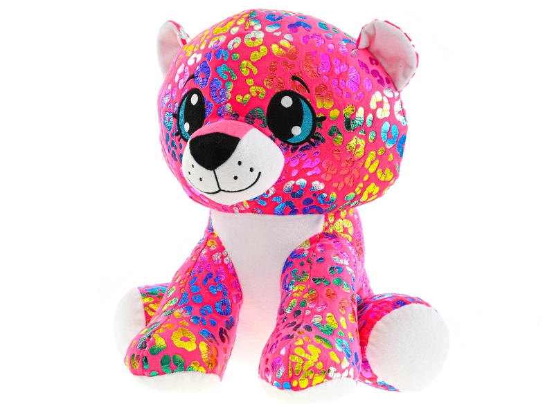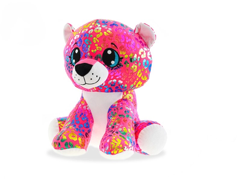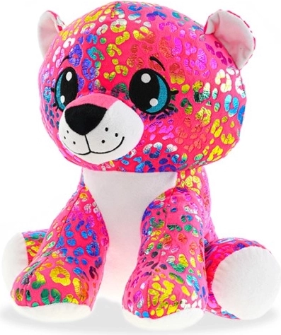 Ez a színes plüss leopárd tökéletes társ a gyerekeknek – puha, selymes, és a ülő formának köszönhetően könnyű megfogni, illetve kiállítani a polcon. Nagy, hímzett szemei, a csillogó minta és a kontrasztos fehér tappancsok egyedi megjelenést adnak neki, amelyet a gyerekek azonnal megszeretnek.