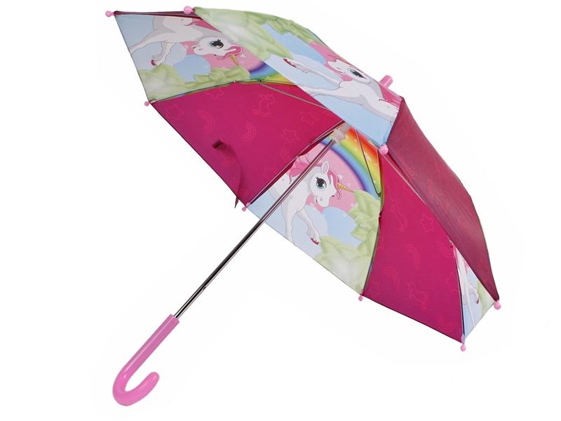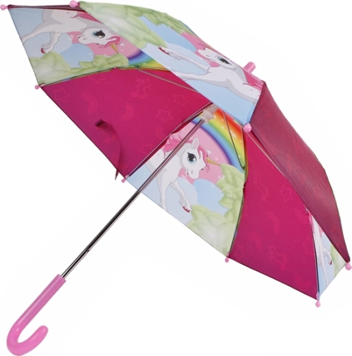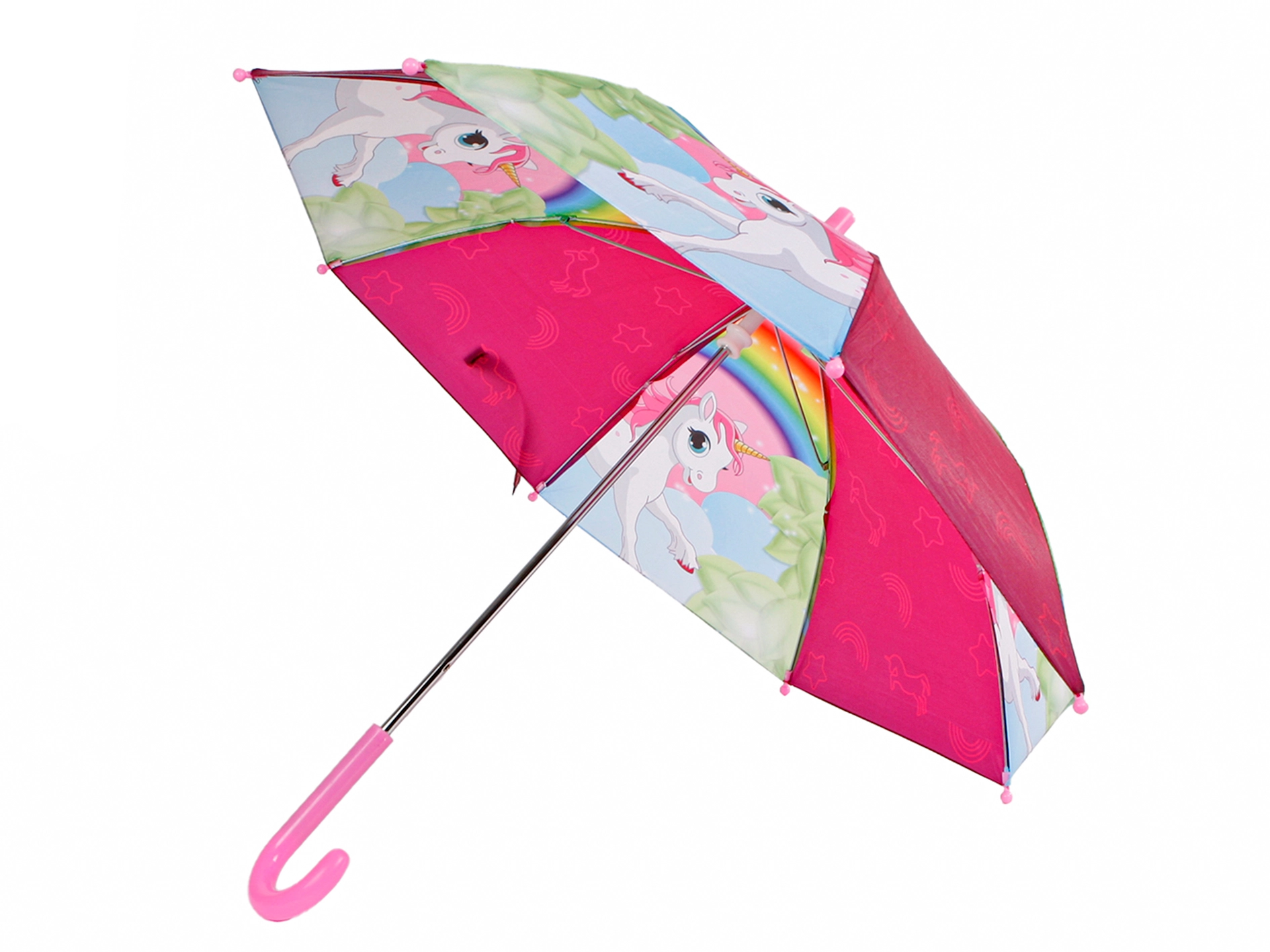 A rózsaszín, unikornisos mintájú, bájos gyermek esernyő minden kis divatrajongót felvidít. 68 × 60 cm-es méretével megbízható védelmet és kényelmes fogást kínál. A könnyű és tartós esernyő mesés mintájával a legesősebb napot is mókássá varázsolja.