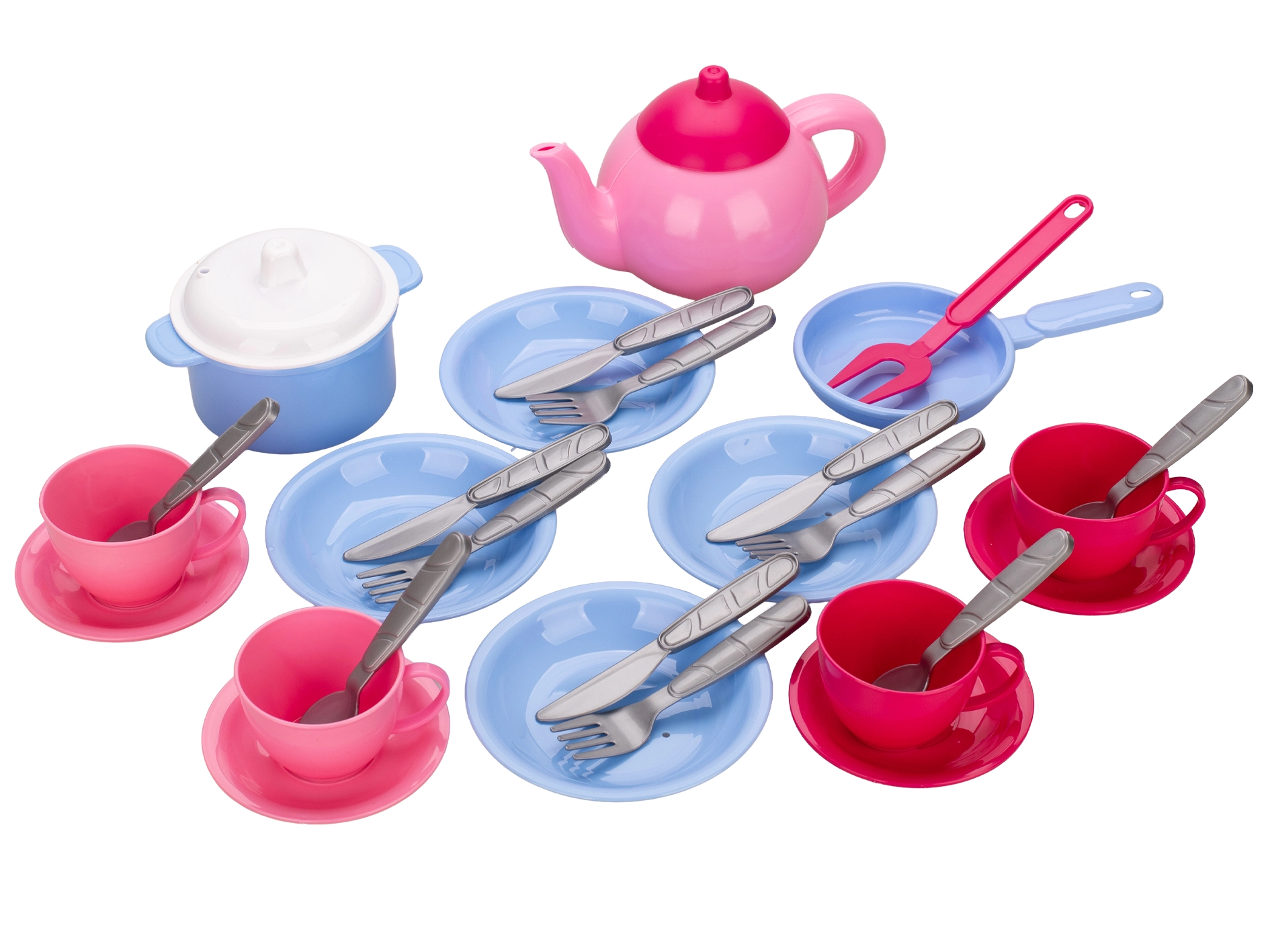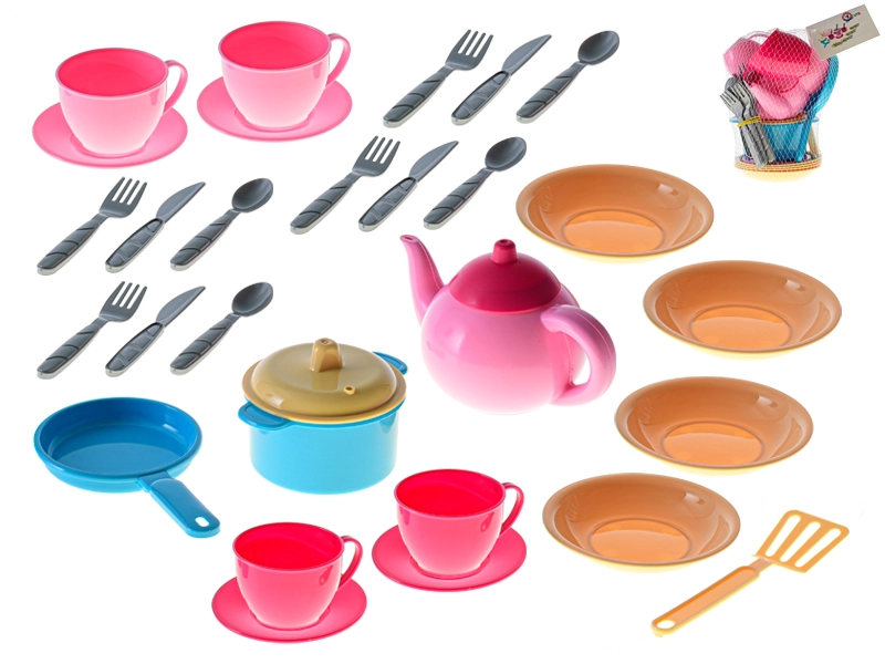 Szórakoztató gyerek konyhai edénykészlet 30 színes darabbal, amely örömet szerez kis szakácsoknak és szakácsnőknek. Tartalmaz kannát, fedős lábost, serpenyőt, tányérokat, evőeszközöket, csészéket és csészealjakat a főzés és a tálalás élethű utánzásához. A könnyű és tartós műanyag ideális a gyerek kezekhez, és támogatja a képzelőerőt, a finommotorikát és a szociális készségeket. 3 éves kortól ajánlott.