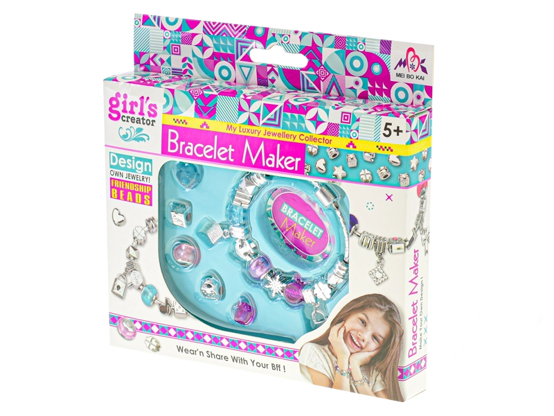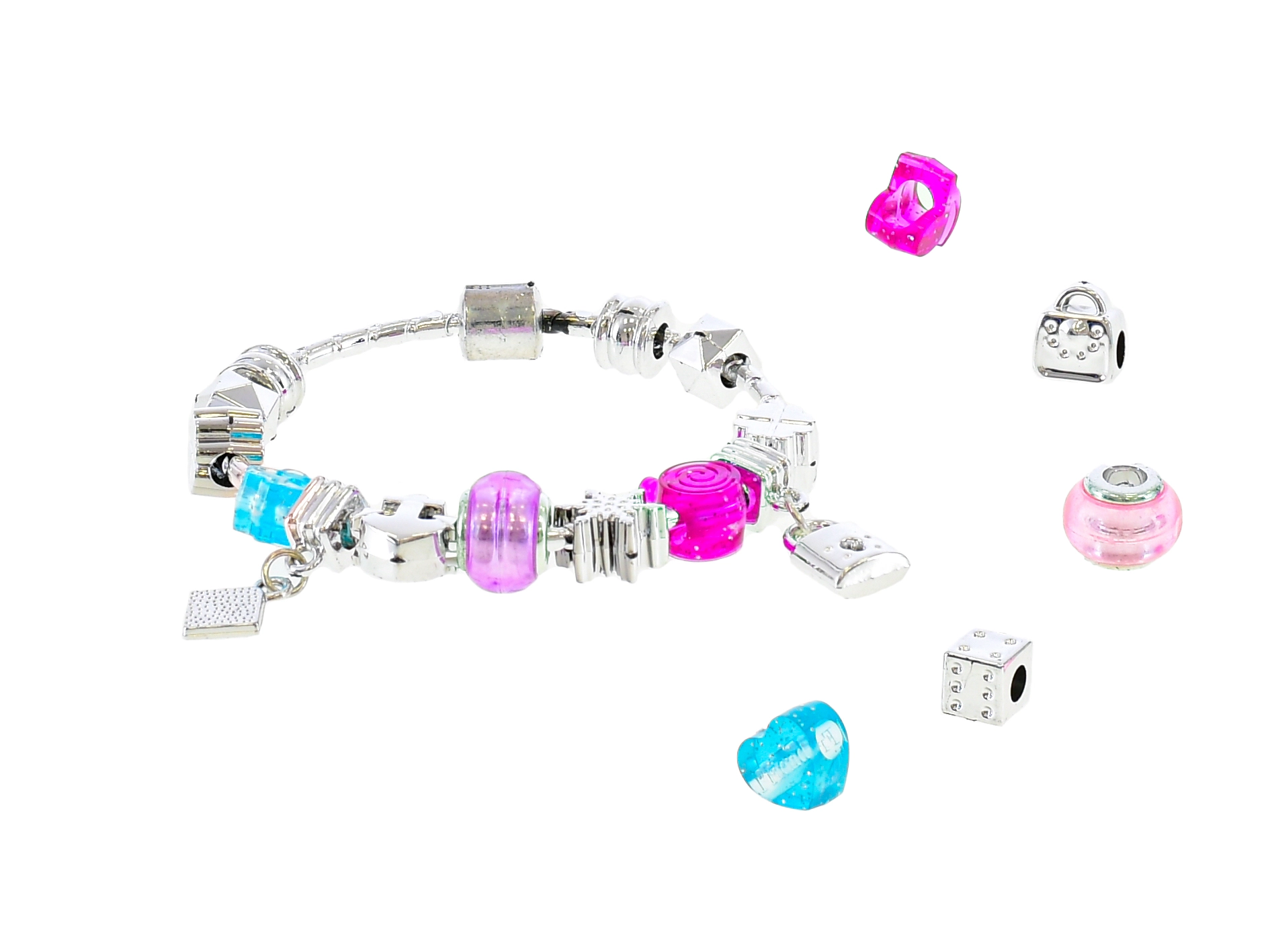 A kreatív szett tartalmaz egy tartós műanyag karkötőt, valamint különféle medálokat és nagy átfűzőnyílású gyöngyöket a kényelmes felfűzéshez. A gyerekek pillanatok alatt összeállíthatják saját színkombinációjukat, és az ékszer megjelenését az öltözékhez vagy hangulathoz igazíthatják.