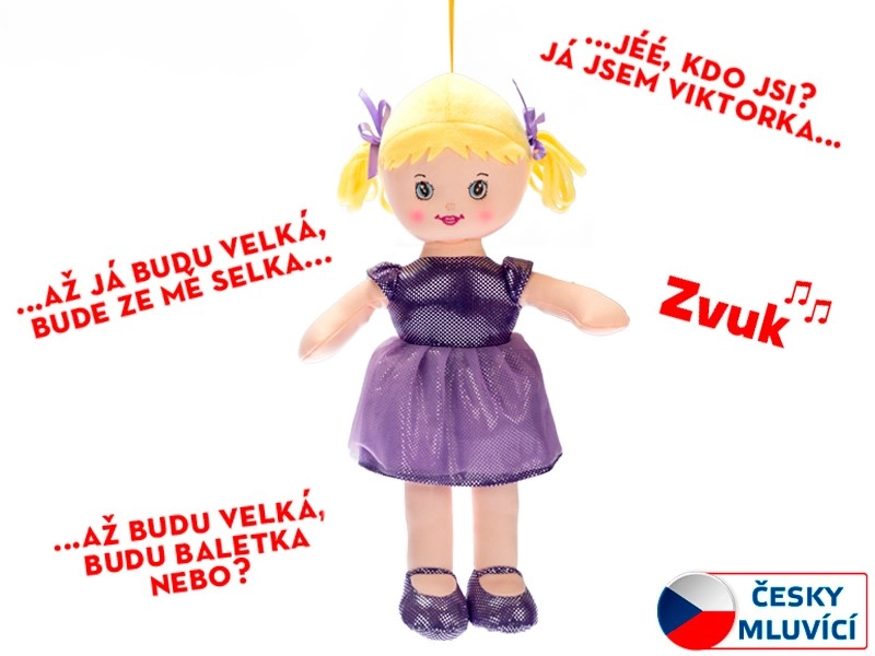 Viktorka egy selymes tapintású textil barát, aki elkíséri a gyerekeket a játékok világának első lépésein. Lila ruhácskája és cipőcskéje magára vonja a figyelmet, megnyomásra pedig magyarul beszél és énekel: „Ha majd nagy leszek, leszek én parasztlány…”. Remek választás az érzékelés, a finommotorika és az érzelmi fejlődés támogatására.
