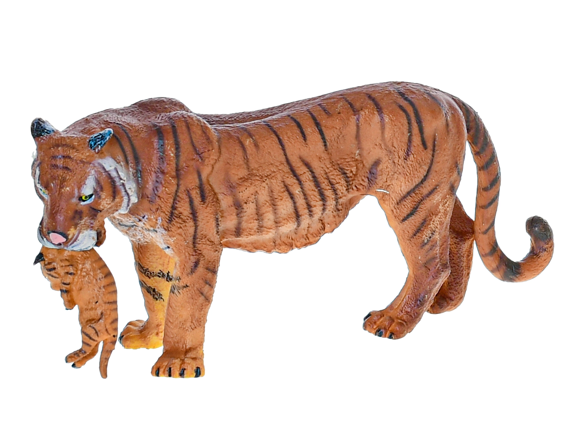A tigrisanya a kölykét a szájában viszi; precíz csíkozás, texturált szőrzet és festett vonások növelik a játék hitelességét.