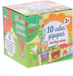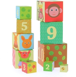 Ez a színes, egymásba rakható torony a VILAC márkától 10 darab masszív kartonkockát tartalmaz számozott oldalakkal és állatillusztrációkkal. A gyerekek magas tornyot építhetnek, vagy egymásba tehetik a kockákat, így természetes módon gyakorolják a számolást, a méretek megkülönböztetését és az egyensúlyt.