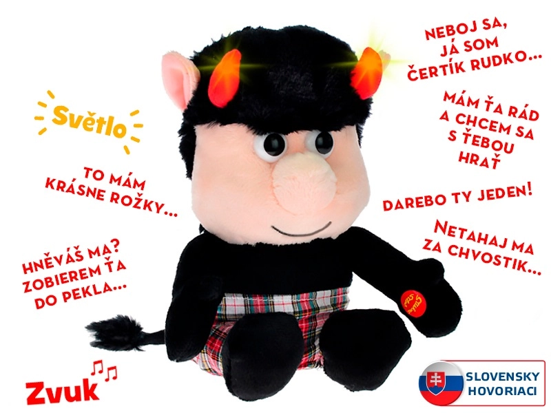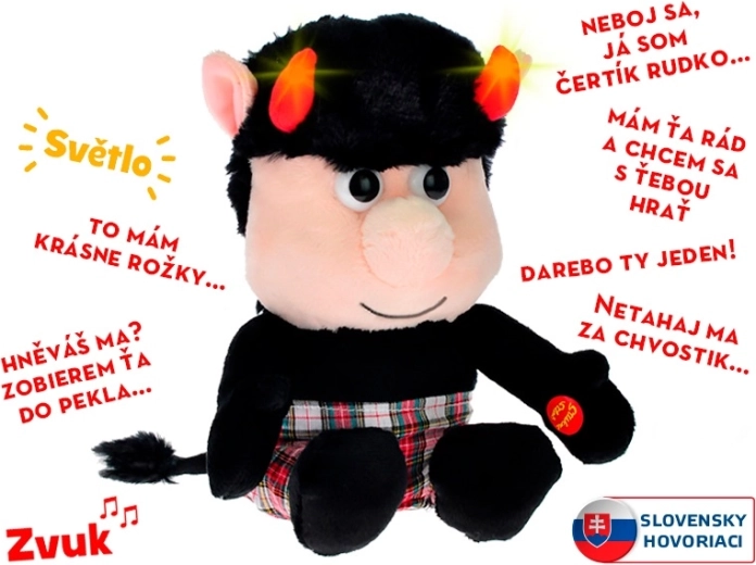 A plüss Rudko ördögcske vidám társ a mindennapi játékhoz. Kellemes plüss anyagának köszönhetően tökéletes ölelgetéshez, miközben mókás szlovák beszólásai és villogó szarvai gyerekeket és felnőtteket egyaránt megnevettetnek. Elég megnyomni a kezét, és kezdődhet a móka.