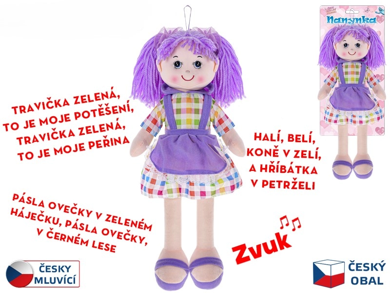 A bájos Nanynka baba puha testtel minden kis hercegnőt elvarázsol. Magassága 50 cm, lila ruhácskát visel, és a funkcióinak köszönhetően magyarul beszél és énekel. Puha kialakítása biztosítja a biztonságos és kényelmes játékot már újszülött kortól. A tápellátást 3× LR44 gombelemmel biztosítják, amelyek a csomag részét képezik.