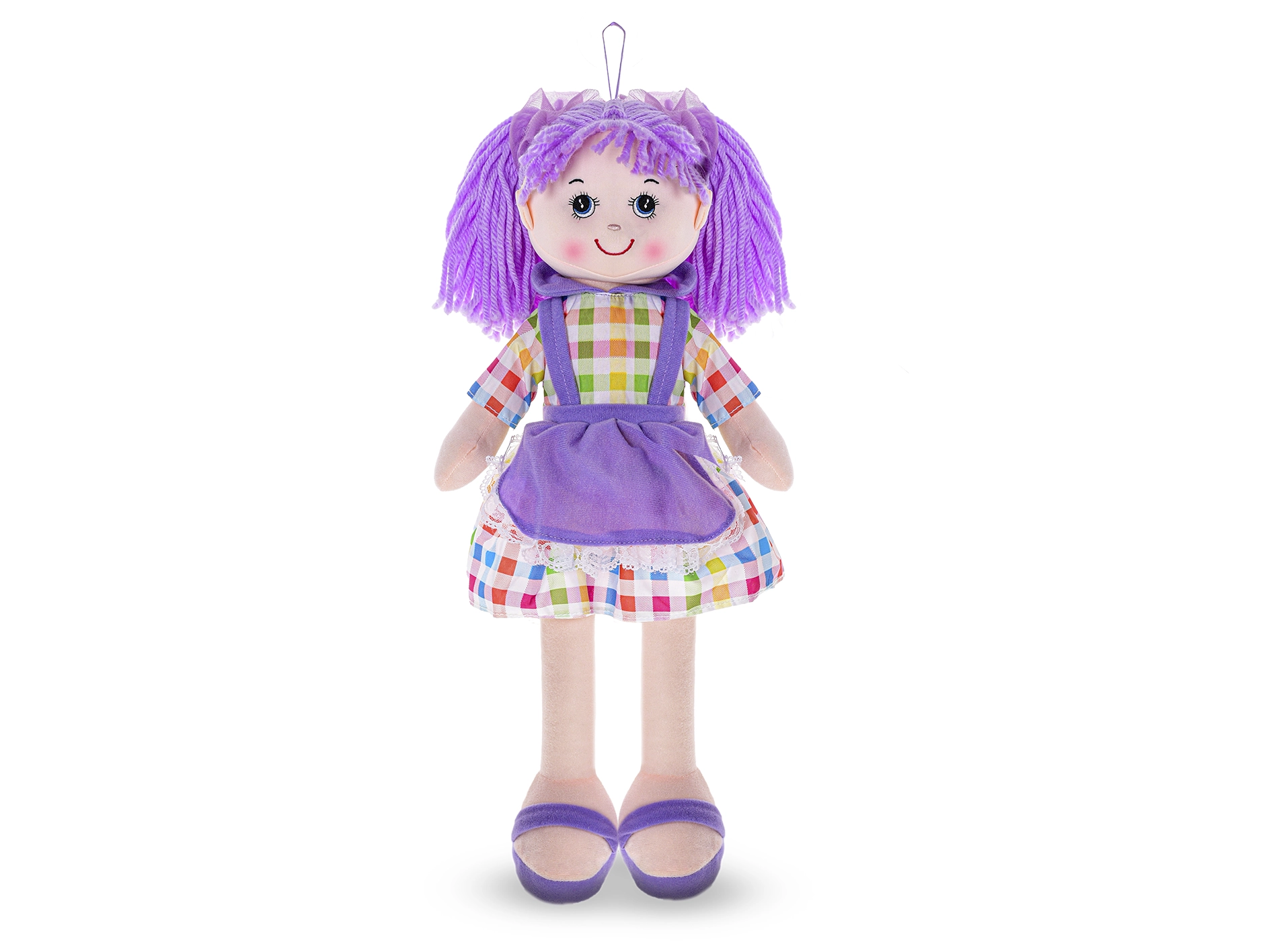 A lila ruhácska és a gyapjúból készült haj igazi, szerethető megjelenést kölcsönöz a babának. Az 50 cm-es magasság ideális az ölelgetéshez, a szerepjátékhoz és a közös elalváshoz.