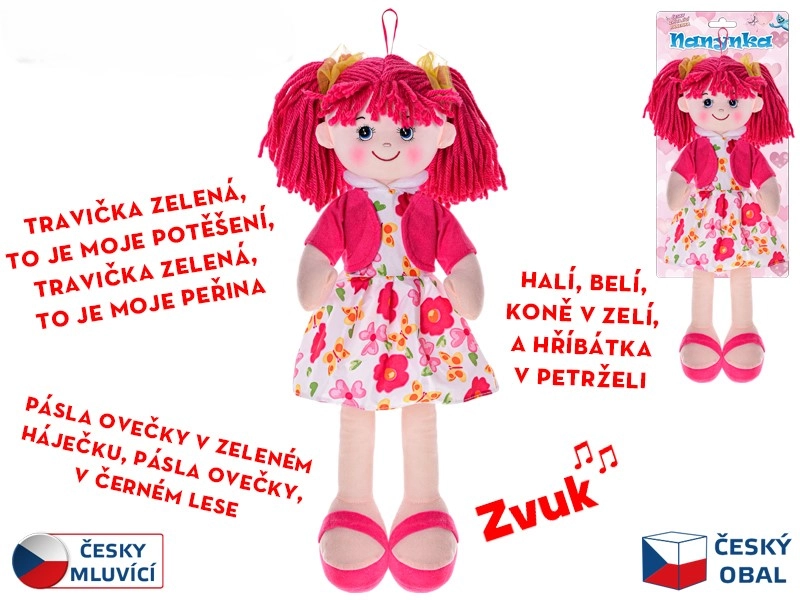A Nanynka szövetbaba finom megjelenésével és selymes tapintású testével varázsolja el a gyerekeket. 50 cm-es magasságának köszönhetően könnyen megfogható, ölelgethető, és elkíséri a kicsiket játék közben és elalvásnál is. A pocak megnyomására Nanynka népszerű cseh dalokat énekel (pl. „Halí, belí…”, „Travička zelená…”, „Pásla ovečky…”) és szaval, ezáltal támogatja a hallásészlelés, a ritmusérzék és a beszédkészség fejlődését.