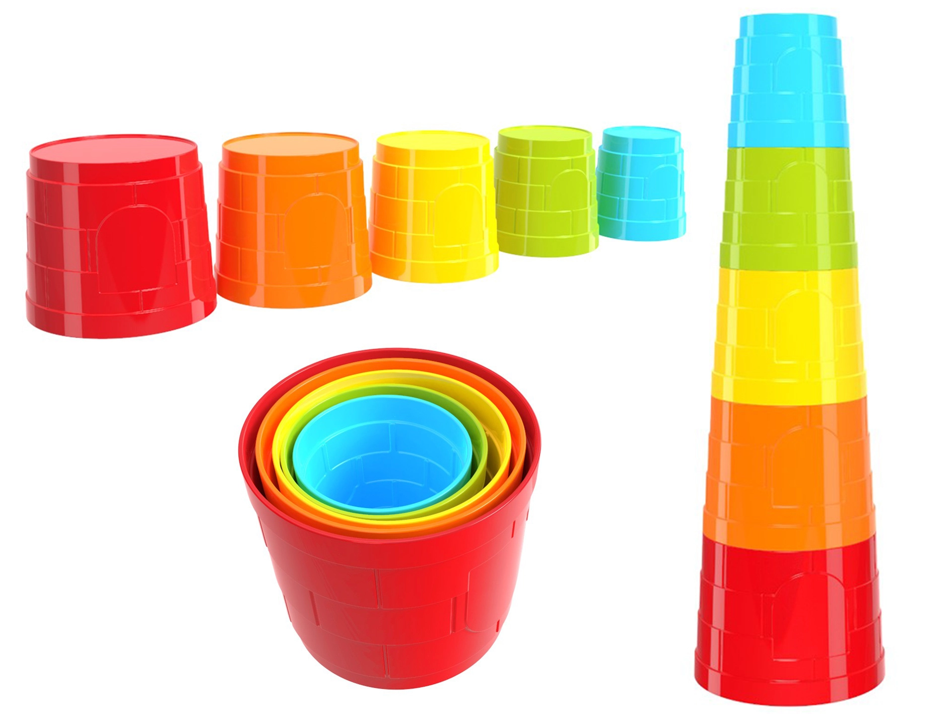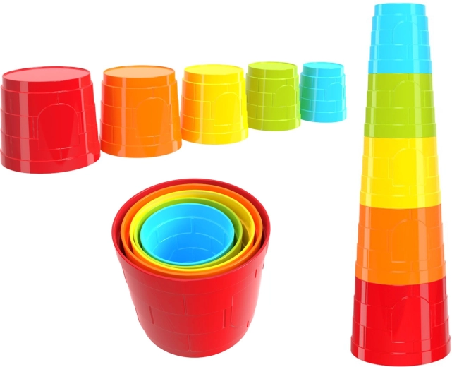 A rakásolható poharak ideálisak az első építőjátékokhoz. Az öt, szivárványszínekben pompázó kerek pohár felfedezésre ösztönzi a gyerekeket a méretek, formák és az egyensúly terén. Minden elem belehelyezhető a nagyobba az egyszerű tárolás és hordozás érdekében, vagy egymásra rakható, hogy stabil, vidám, várra emlékeztető tornyot alkossanak.