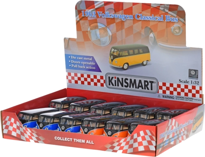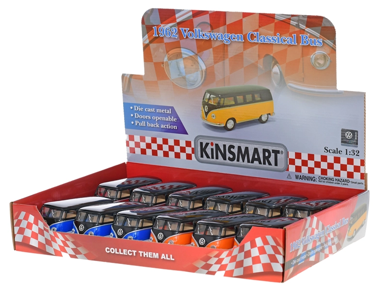 Részletgazdagon kidolgozott Volkswagen Classical 1962 fém buszmodell 1:32 méretarányban, amely örömet szerez gyűjtőknek és gyerekeknek egyaránt. Autentikus megjelenést, nyitható ajtókat és szórakoztató visszahúzós (pull-back) meghajtást kínál előremenethez. 13 cm hosszú, négy színváltozatban kapható, a fém és műanyag kombinációjának köszönhetően tartós, és 3 éves kortól ajánlott.