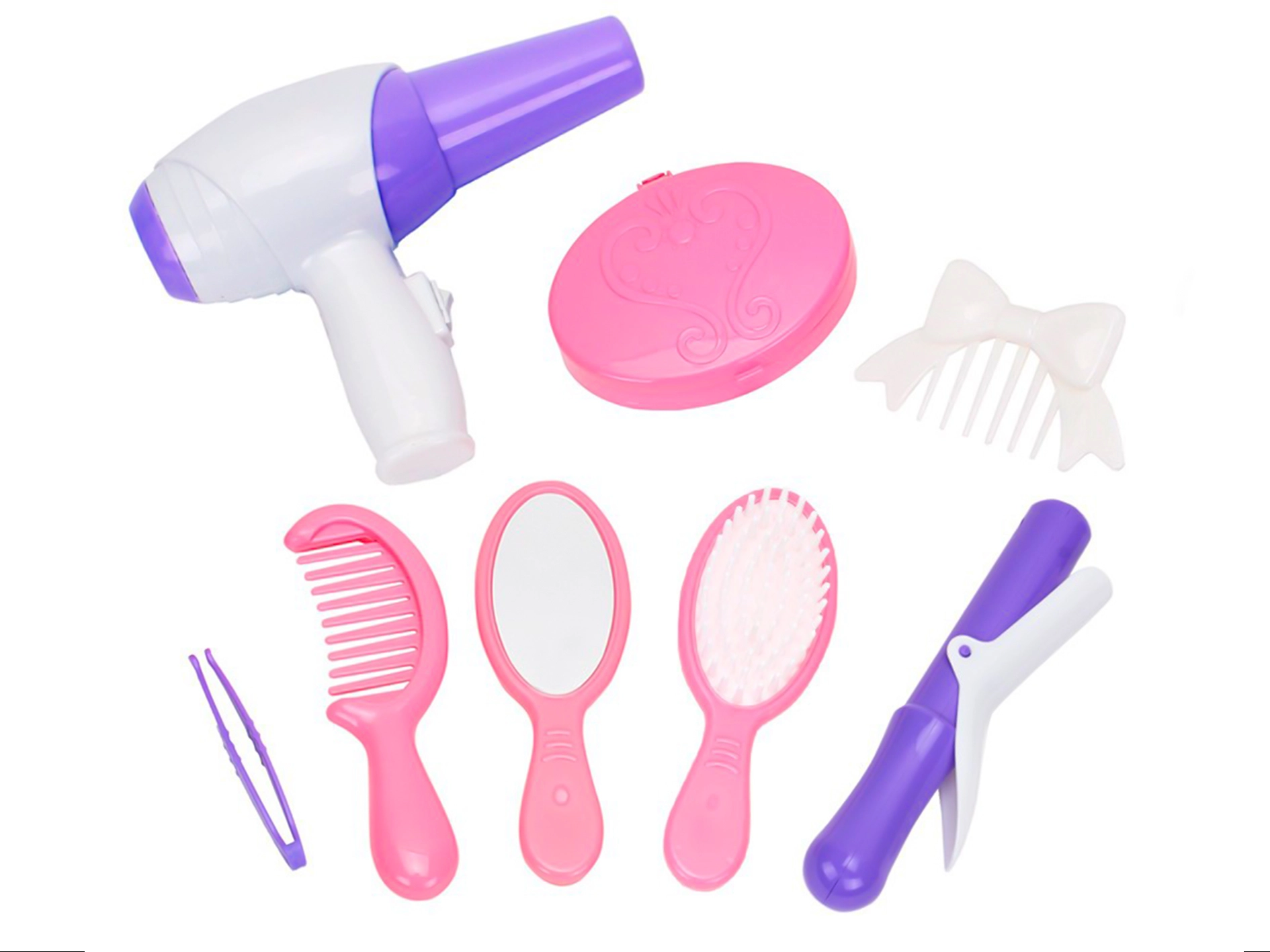 - Hajszárító, hajsütővas, fésű, kefe, tükör, masnis kis fésű, púderdoboz, csipesz