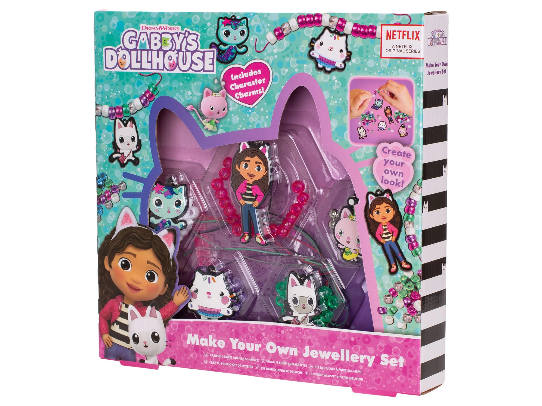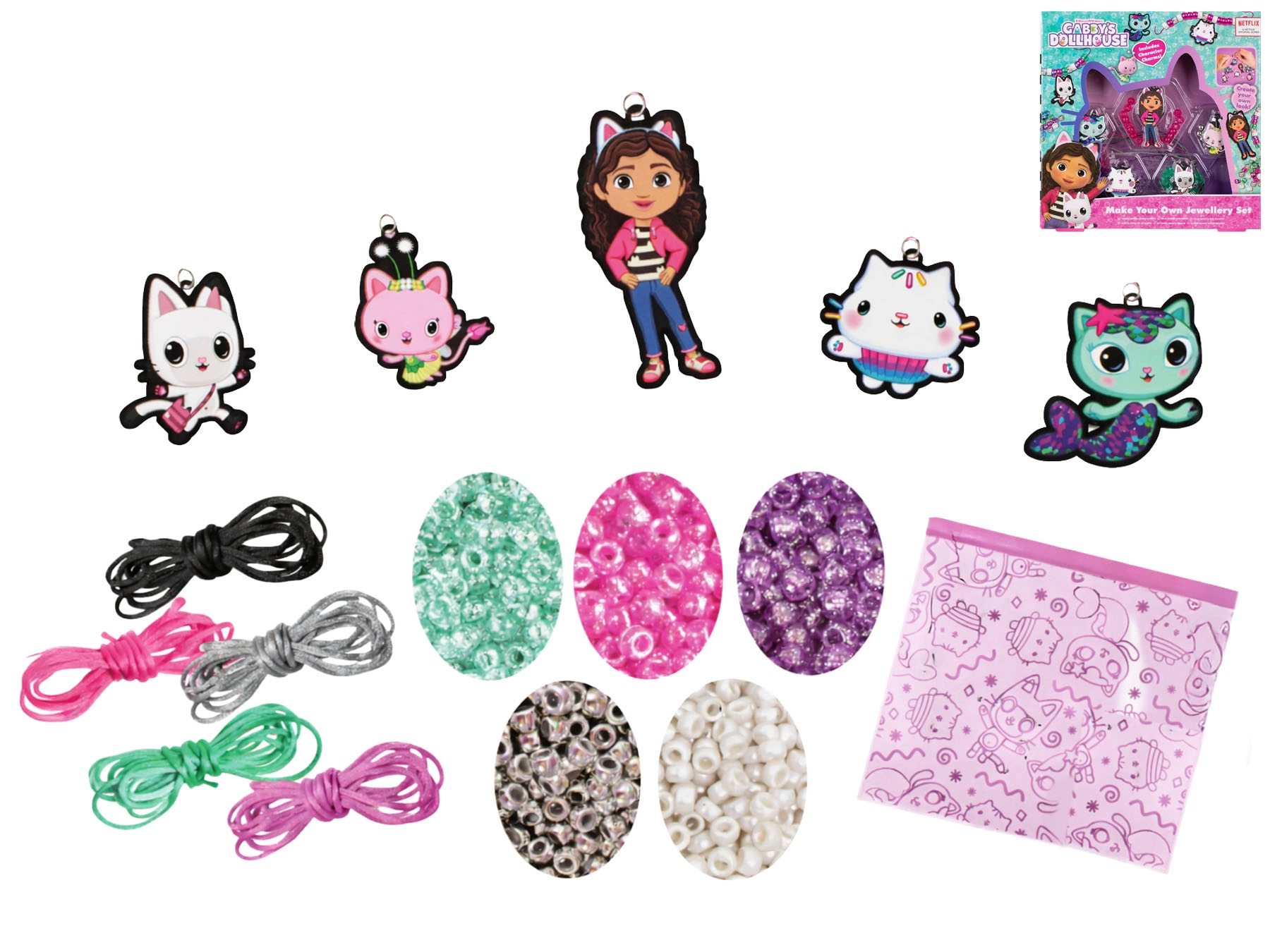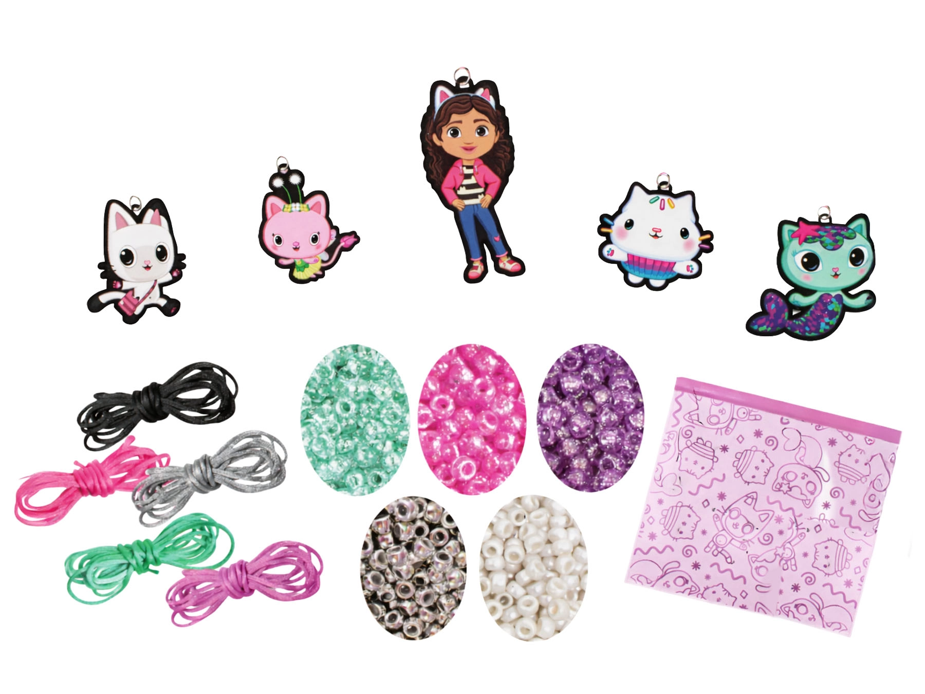 Ezzel a szórakoztató ékszerkészítő szettel a gyerekek könnyedén megtervezhetik és összeállíthatják saját karkötőiket és nyakláncaikat. A színes gyöngyök és a Gabby varázslatos házikója szereplőit ábrázoló tematikus medálok ösztönzik a fantáziát, és lehetővé teszik, hogy a gyerekek teljesen a saját stílusuk szerint alkossanak egyedi kiegészítőket.