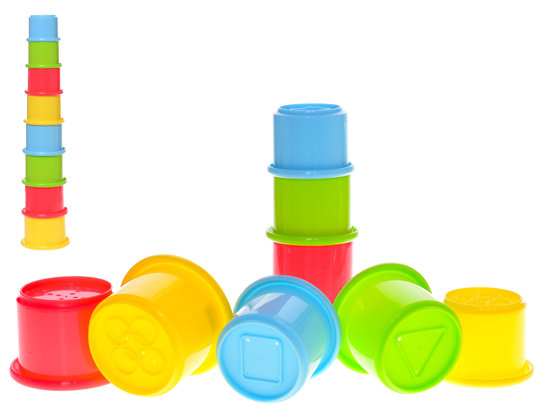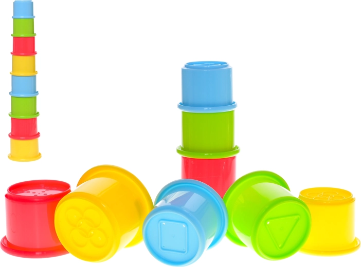 Fedezze fel a nyolc színes pohárból álló vidám készletet, amelyet könnyen egymásra lehet rakni stabil toronnyá. A játék ideális 6 hónapos kortól, és támogatja a finommotorika fejlesztését, a koordinációs készségeket és a logikus gondolkodást. A különböző méreteknek és színeknek köszönhetően a gyerekek megismerik a színeket és formákat, miközben a poharak domború felülete serkenti a taktilis ingereket. A könnyű és tartós műanyag egyszerű kezelhetőséget biztosít, a praktikus háló pedig megkönnyíti a szállítást és tárolást.
