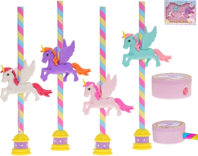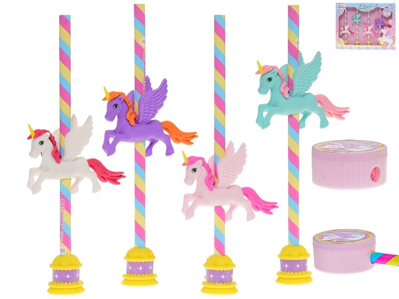 Az Unikornis ceruzakészlet ideális választás az iskolai tolltartóba és az otthoni kreatív tevékenységekhez. A négy, HB keménységű fa ceruza simára, maszatolás nélkül ír, a beépített radírok gyors javítást tesznek lehetővé, a mellékelt hegyező pedig mindig éles hegyet biztosít. A játékos unikornis motívumok minden napba egy adag fantáziát visznek.