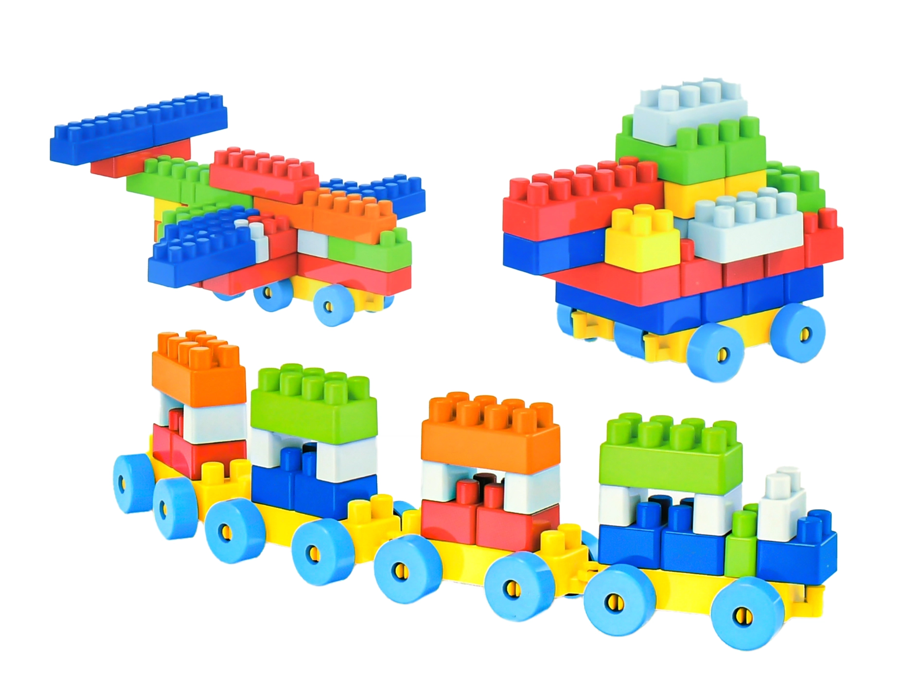 Ez a sokoldalú építőkészlet 100 strapabíró műanyag elemet tartalmaz, köztük kerekes alvázakat a könnyen guruló modellekhez. A gyerekek megépíthetik saját kis vonatukat vagonokkal, egy autót vagy egy kis repülőt, és tetszés szerint kombinálhatják őket.