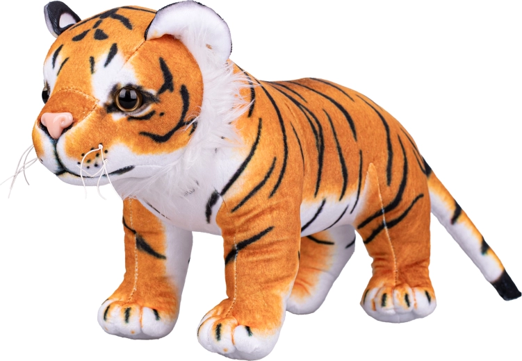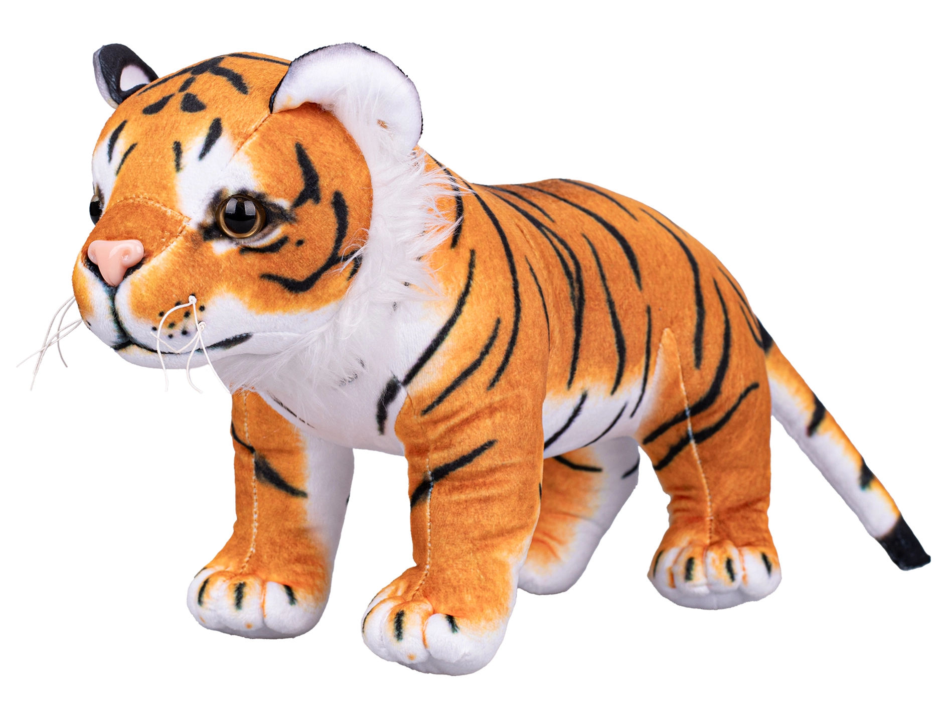 A 35 cm-es, aranyos plüss indiai tigris puha társ már újszülött kortól. Realista kidolgozást, puha anyagt az ölelgetéshez és álló pózt kínál, így ideális bújós játéknak és gyerekszobai dekorációnak is. Biztonságos kivitele támogatja a érzékszervi fejlődést és a gyermeki fantáziát.