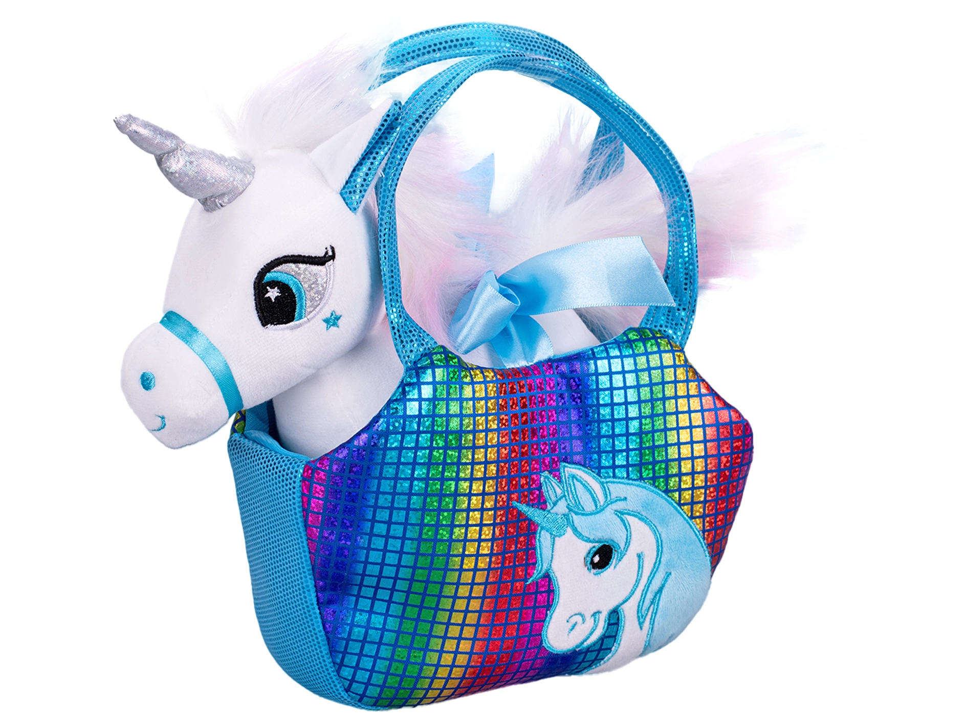 Ez a bájos plüss unikornis puha és biztonságos plüssből készült, ideális újszülötteknek és totyogóknak. A stílusos táskának köszönhetően a játék könnyen magaddal vihető sétákra, látogatásokra vagy akár az óvodába – ráadásul remekül kiegészíti a kis divatrajongók öltözékét.