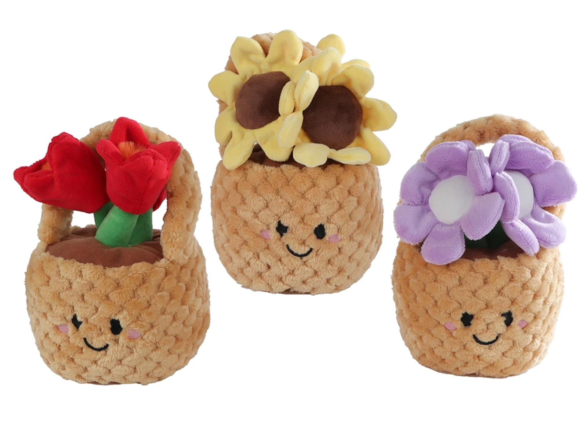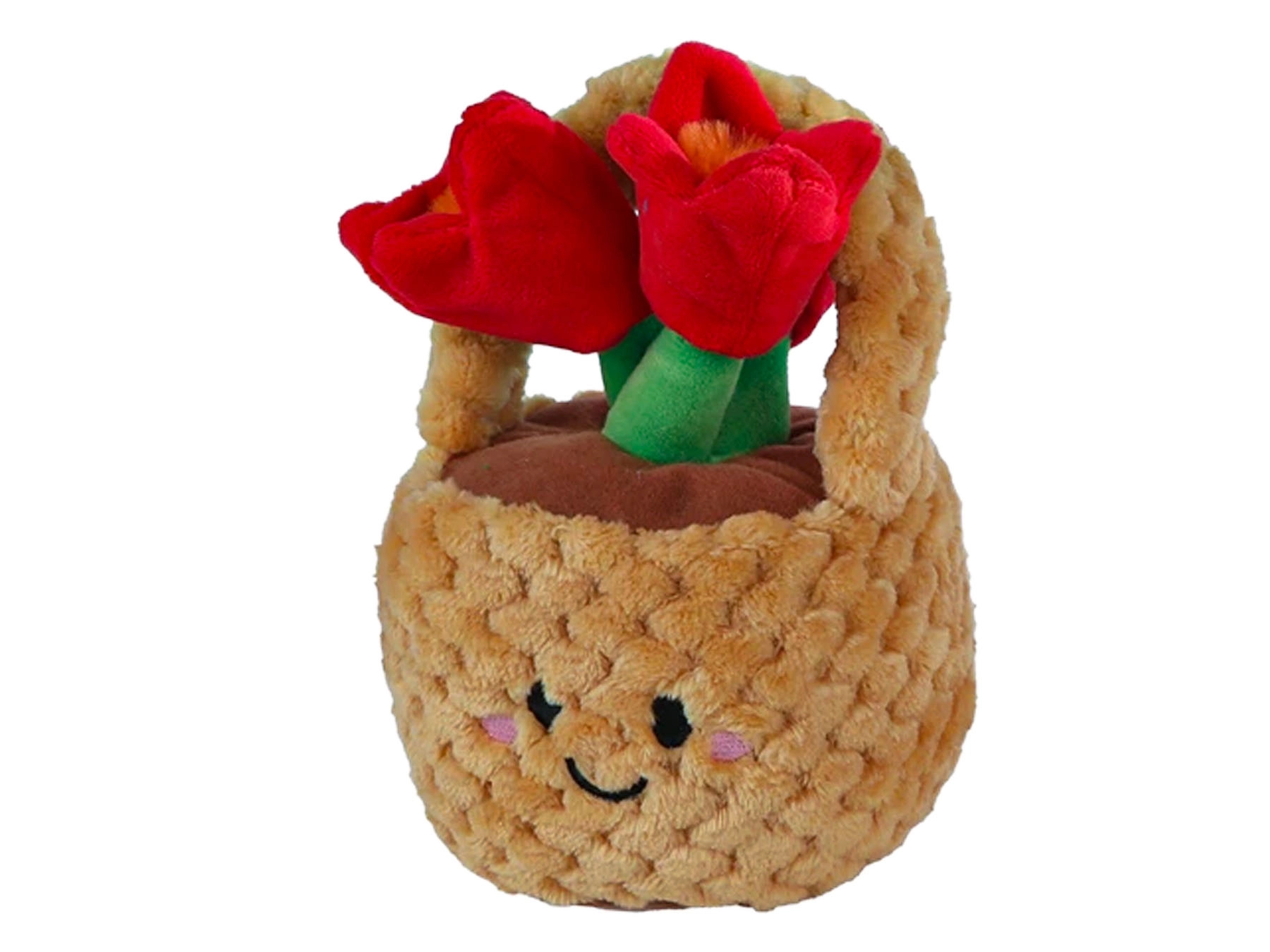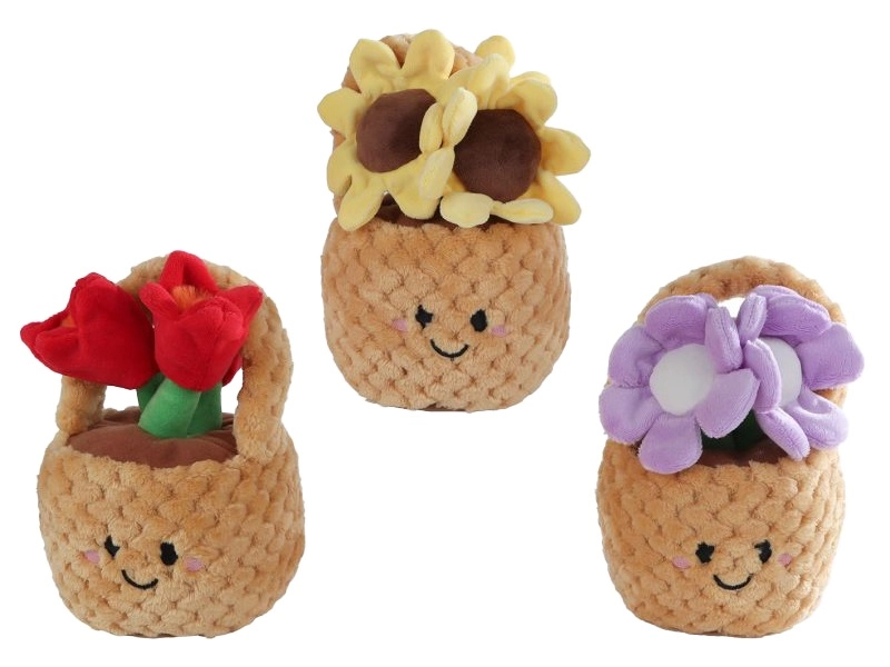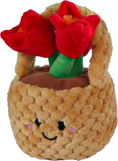 Aranyos plüss kosár mosolygó arccal és virágokkal, amely meghittebbé teszi a gyerekszobát, és már újszülött kortól örömet szerez. Puha, hipoallergén plüss, biztonságos kialakítás éles részek nélkül és ideális méret a kisgyermek kezébe (18 cm) – támogatja a finommotorikát és a tapintási érzékelést. Három virágszínben elérhető – lila, sárga és piros.