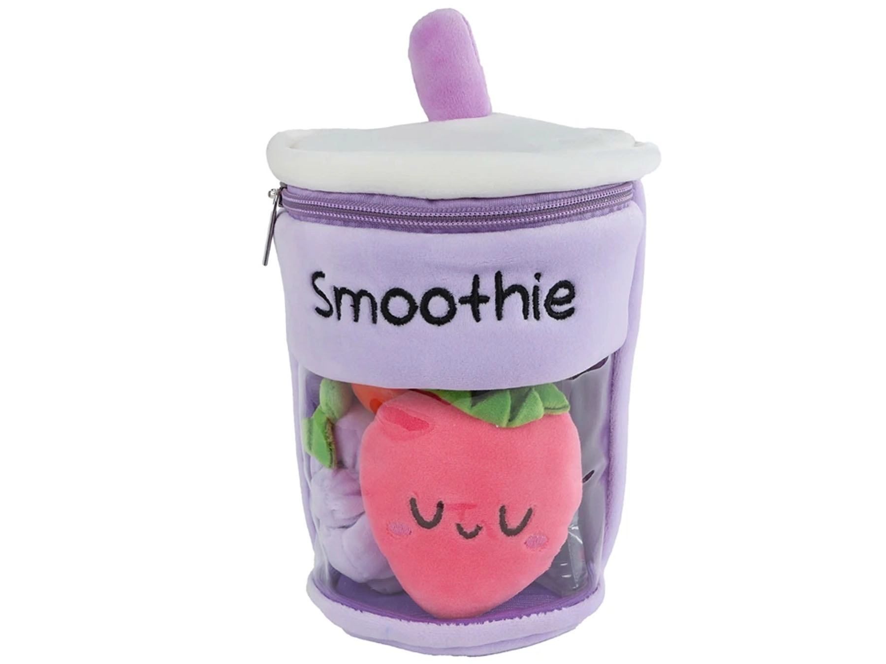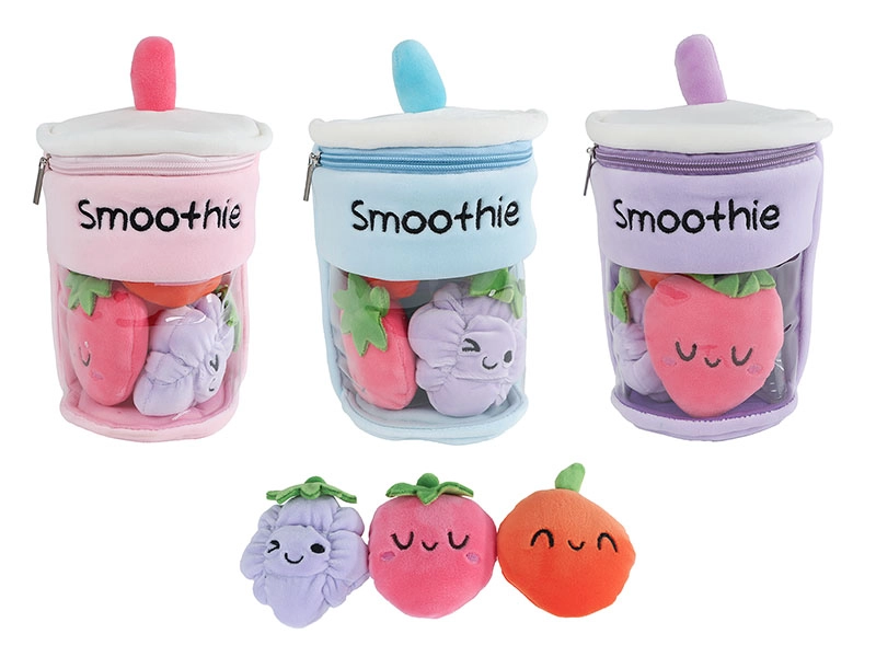 Aranyos, 25 cm magas plüss smoothie pohár, amely belül három kis plüss gyümölcsöt rejt. A könnyen nyitható cipzárnak köszönhetően támogatja az interaktív játékot és a finommotorika fejlődését. Puha, kellemes tapintású anyaga és a vidám, mosolygós gyümölcsös design örömet szerez a 3 évesnél idősebb gyerekeknek. Három színváltozatban kapható: rózsaszín, kék és lila.