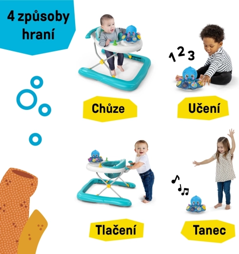 Az Opus polippal ellátott elektronikus központ 3 üzemmódot kínál: Walking az egyes lépések jutalmazásához, Learning a színek, számok és formák tanításához 4 nyelven (EN, ES, FR, DE), valamint Dancing az óceán zenéjéhez és hangjaihoz. A stabil kialakítás, a 3 magassági szint és az egyszerű összecsukás kényelmet biztosít otthon és útközben is. Az ülés gépben mosható a gyors és higiénikus karbantartásért.