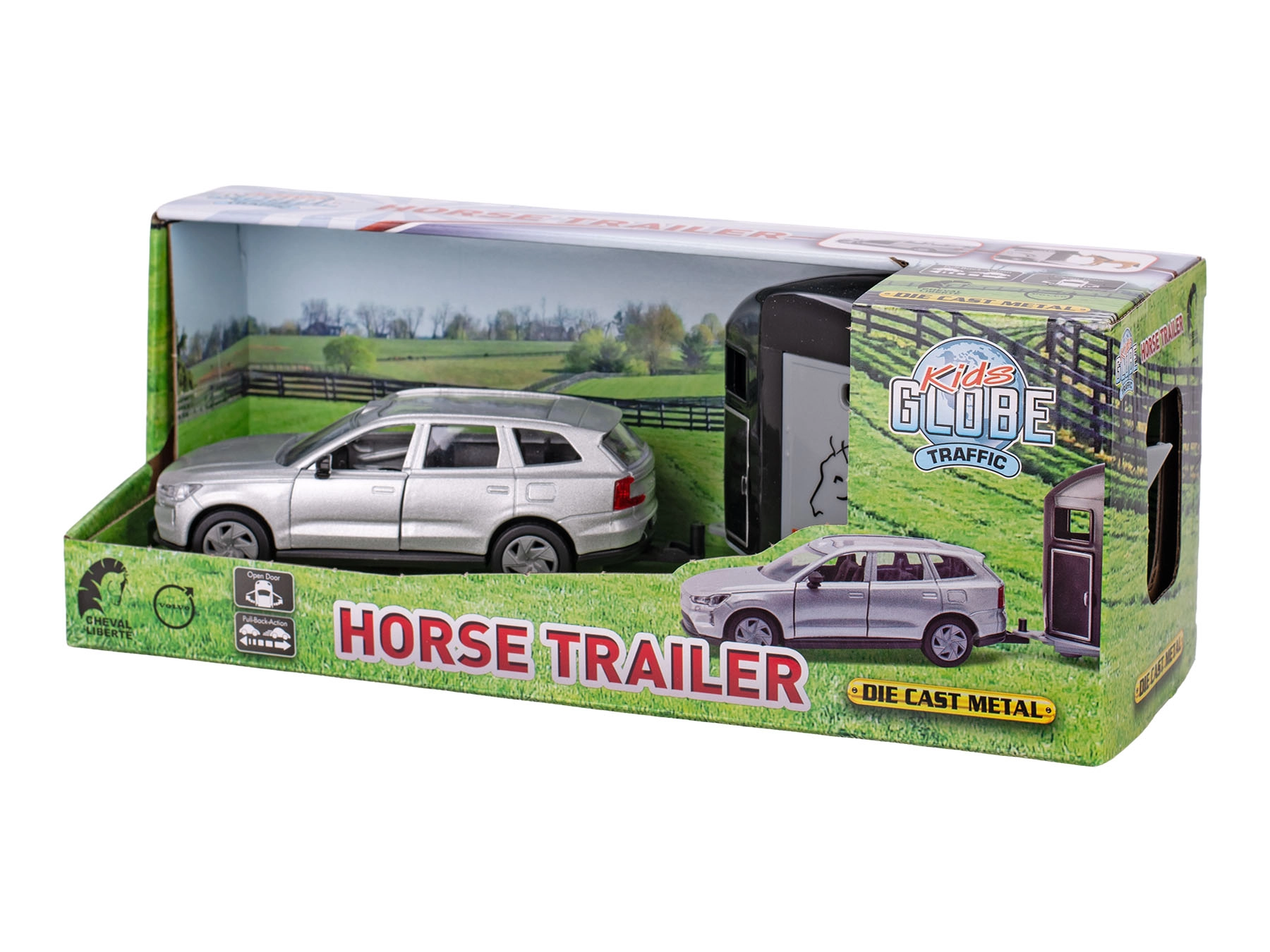 Fedezze fel a licencelt VOLVO EX90 modellt hagyományos, lovak szállítására szolgáló utánfutóval, amely remekül ötvözi a modern dizájnt a klasszikus farmjelenetekkel. A kiegyensúlyozott fém és műanyag alkatrész kombinációnak köszönhetően a modell masszív, könnyű és könnyen irányítható.