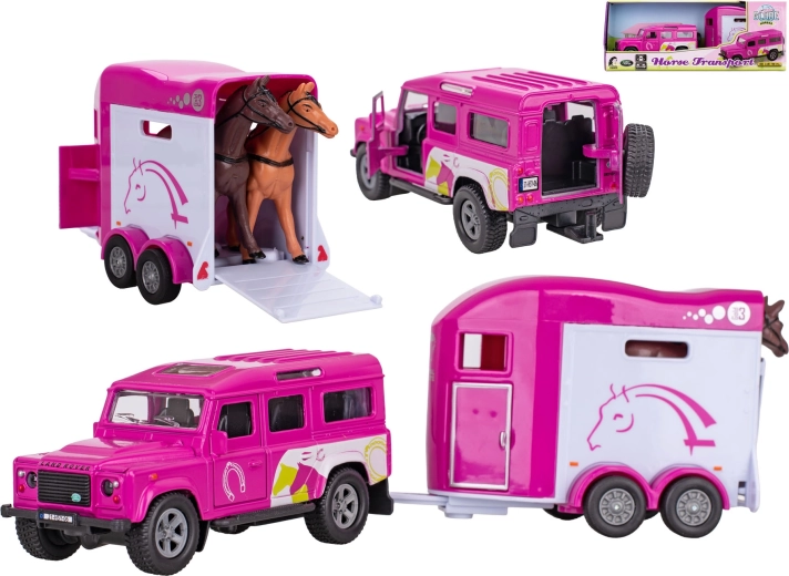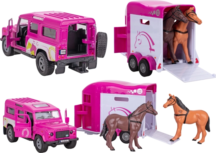 Stílusos Land Rover ló-szállító utánfutóval rózsaszín színben, amely örömet szerez minden kis lovaglás- és farmrajongónak. Visszahúzós meghajtást, nyitható első ajtókat és fém és műanyag felhasználásával készült, tartós kialakítást kínál. Az utánfutó alkalmas lófigurák biztonságos szállítására (nem tartozékok). 28 cm-es teljes hossz és dobozos csomagolás teszi remek ajándékká 3 éves kortól.