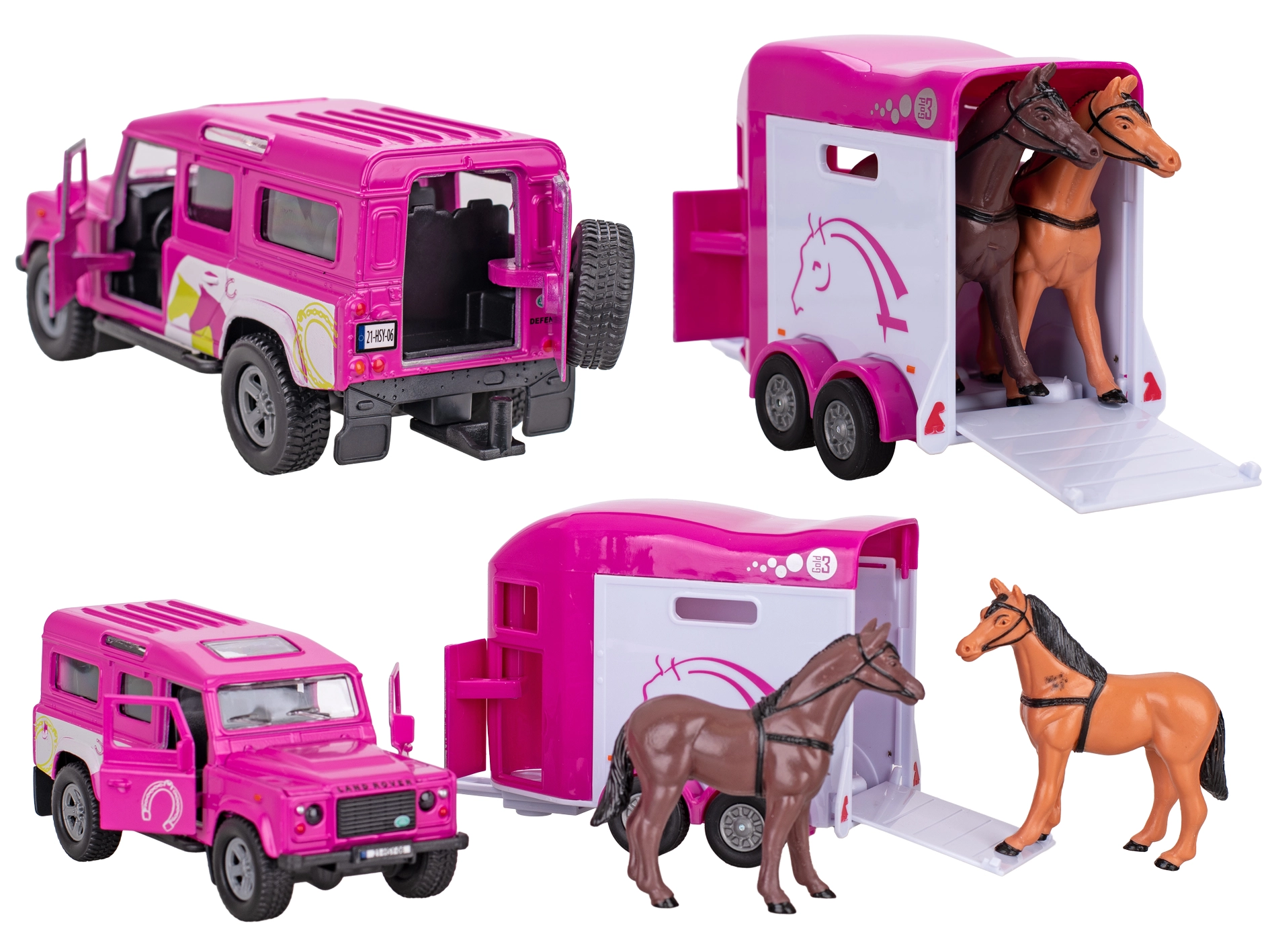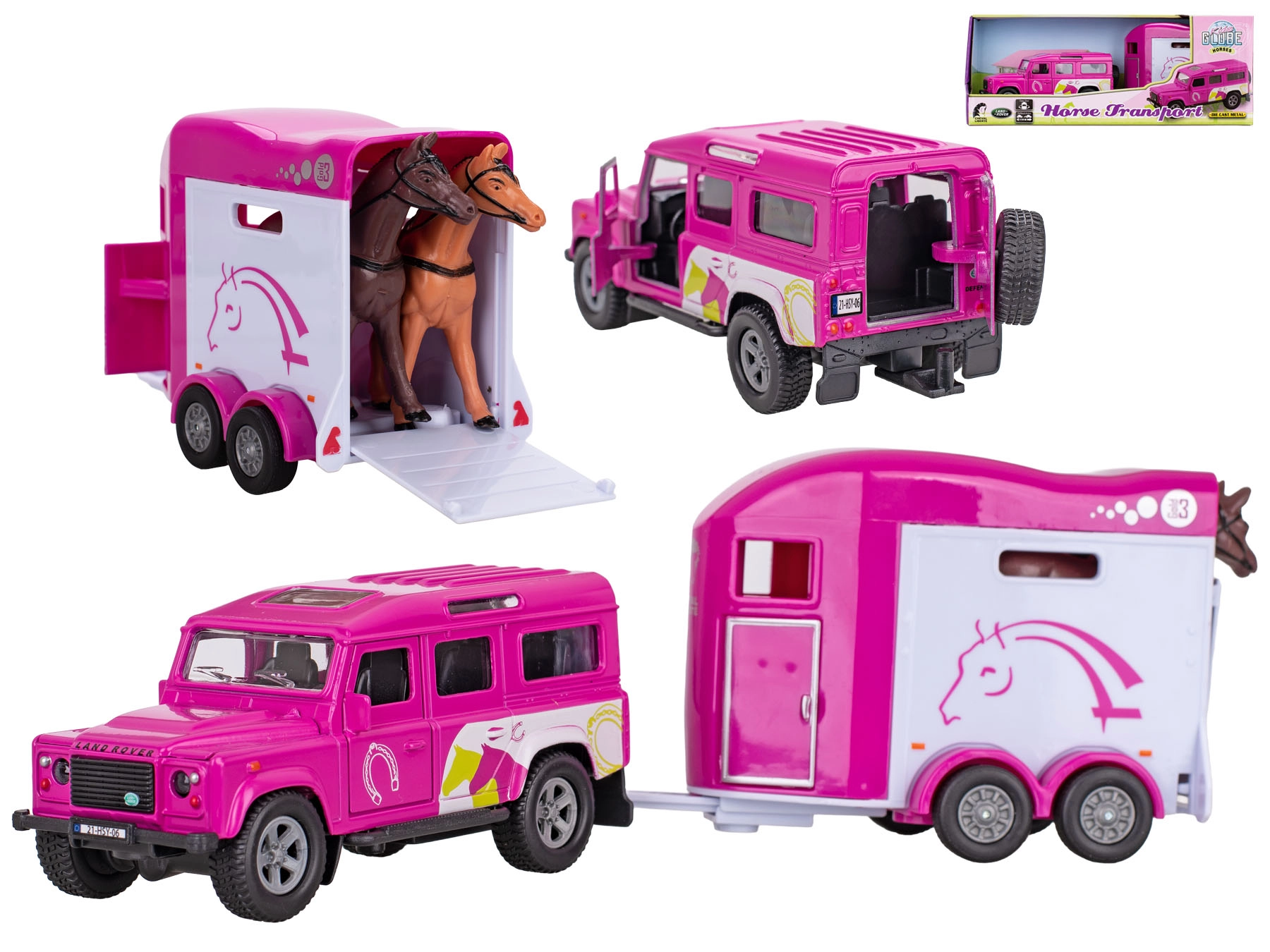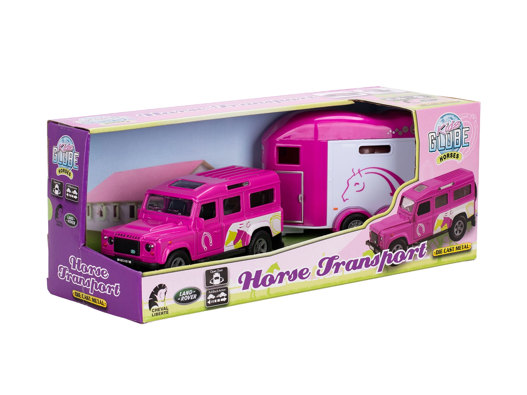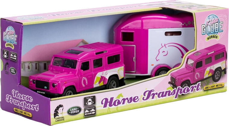 Fedezze fel a Kids Globe valósághű szettjét az ikonikus Land Roverrel és a ló-szállító utánfutóval, vonzó rózsaszín színben. A karosszéria és a belső részletek kidolgozottsága, a nyitható első ajtók és a visszahúzós meghajtás számtalan játékélményt és szórakozást garantál. A fém és minőségi műanyag kombinációjának köszönhetően a modell strapabíró, és készen áll a mindennapos játékra.
