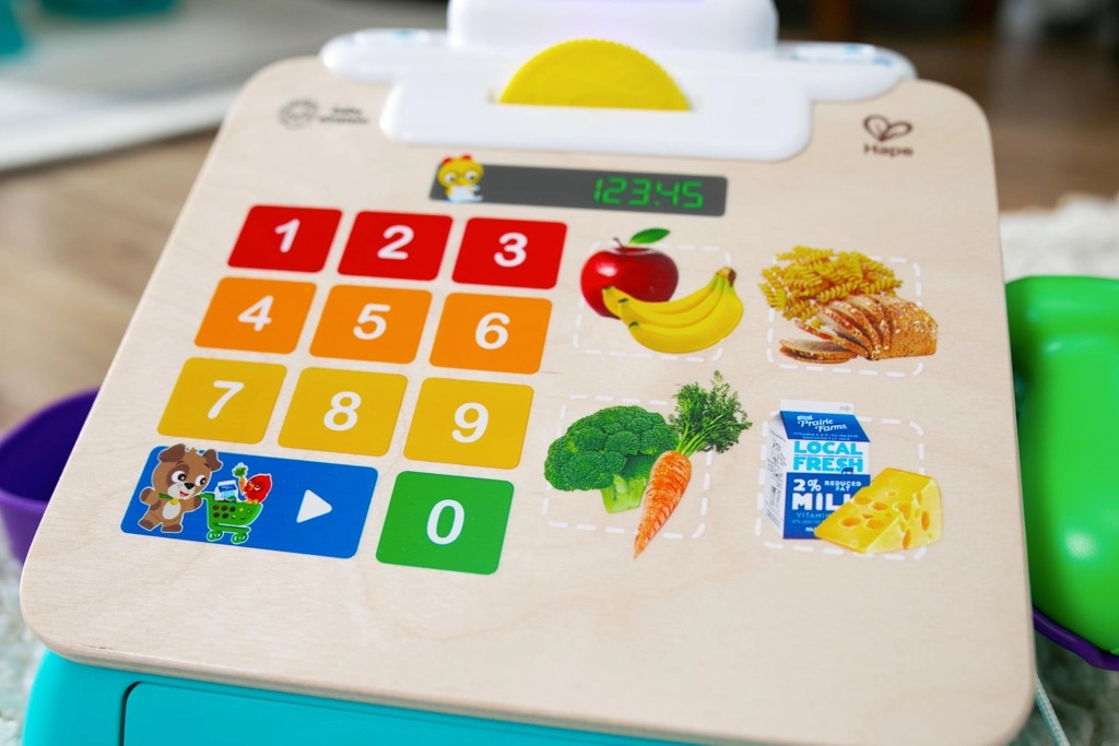Interaktív gyerek pénztár Magic Touch technológiával, amely FSC tanúsítvánnyal rendelkező fát és tartós műanyagot ötvöz a biztonságos, érzékszervi játékhoz. Fényeket, dallamokat, pénztárhangokat és beszédfordulatokat kínál, számokat és ételeket tanít négy nyelven, és fejleszti a finommotorikát valamint a szerepjátékot. Tartozék a szkenner, bankkártya és 3 érme, valamint egy praktikus tároló fiók a kiegészítőknek.
