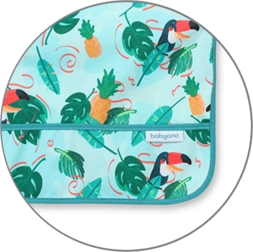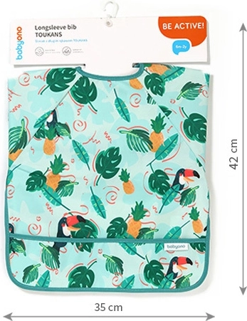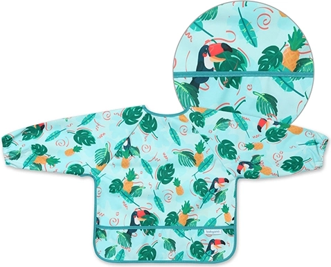 Stílusos és funkcionális, tukán mintás előke, amely teljes törzs- és ujjfedést biztosít, így a ruha minden étkezésnél és rendetlen játéknál tiszta marad. A vízálló, könnyen tisztítható anyagnak köszönhetően ideális az első önálló etetésekhez és kreatív tevékenységekhez.