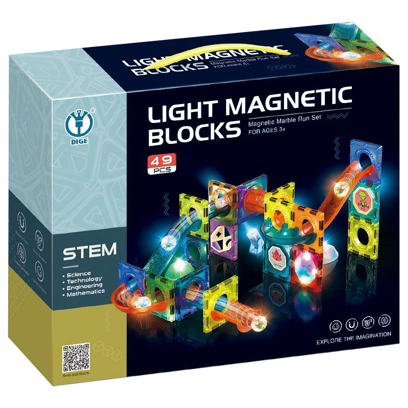A csomagban 49 elem található, köztük mágneses blokkok, áttetsző elemek és reflektorok. Minden világító golyó elemmel működik, így a gyerekek sötétben is önfeledten játszhatnak. A készlet támogatja az önálló felfedezést és a közös játékot is.