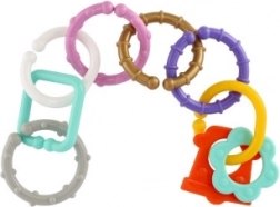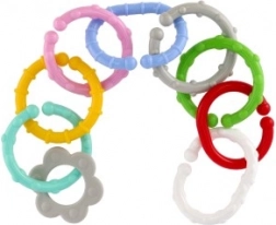 Ez a színes karikákból és formákból álló készlet a legkisebbek számára készült. A változatos színeknek, formáknak és textúráknak köszönhetően a gyerekek természetes módon fejlesztik a érzékszervi észlelést és a kéz–szem koordinációt. Az egyes elemek könnyen összekapcsolhatók és stabilan tartanak, így a kicsik saját láncokat alkothatnak, vagy játékokat rögzíthetnek a babakocsihoz vagy az autósüléshez.