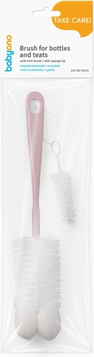 Praktikus BabyOno kefe a cumisüvegek és cumik alapos tisztításához. Különlegesen formázott sörtéi a nehezen hozzáférhető helyeket is elérik, a kényelmes markolat biztos fogást ad, a végén található szivacs pedig megkönnyíti az üveg aljának tisztítását. A csomag része egy mini kefe a cumikhoz és annak praktikus tárolórendszere.