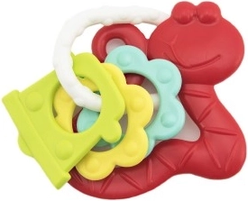 A változatos felületek és karikák gyengéden masszírozzák az ínyt, miközben a csörgő hangja leköti a figyelmet.