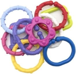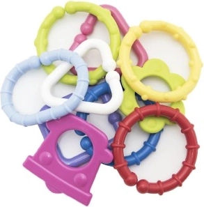 Ez a színes műanyag formakészlet ideális első játék babáknak. Az elemek könnyen összepattinthatók és stabilan tartanak, így a gyerekek újra és újra készíthetnek láncokat és egyszerű szerkezeteket. A különböző textúrák és színek gazdag érzékszervi ingereket nyújtanak, a csörgő hatás pedig leköti és megnyugtatja a kicsiket.