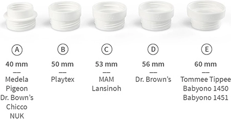 A csomag öt cserélhető adaptert (40–60 mm) tartalmaz olyan márkákhoz, mint a Medela, Chicco, NUK, Dr. Brown’s, Pigeon, Playtex, MAM, Lansinoh, Tommee Tippee és mások. A 43 mm-es üvegek (Avent, BabyOno 402/403) adapter nélkül csatlakoztathatók.