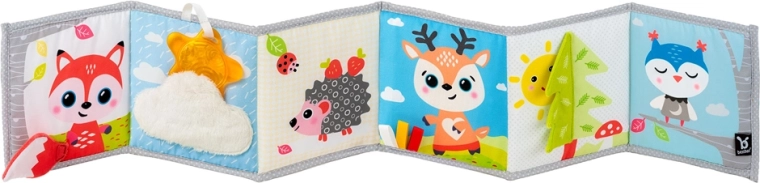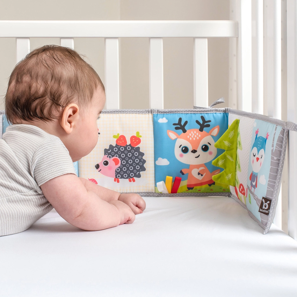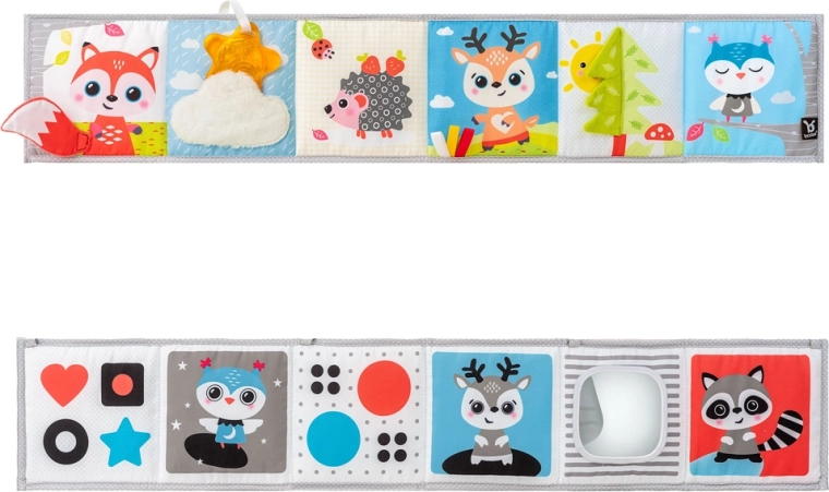 A kétoldalas BENBAT Erdei barátok aktív könyvecske együtt nő a babáddal. A magas kontrasztú (fekete-fehér) oldal ideálisan stimulálja az újszülött látását, míg a színes oldal vidám állatokkal a figyelmet és a fókuszt fejleszti a későbbi fejlődési szakaszokban. A puha anyagok, susogó zónák, tapintható szalagok és a nagy tükör felfedezésre csábítanak, és támogatják a finom- és nagymotorikát.