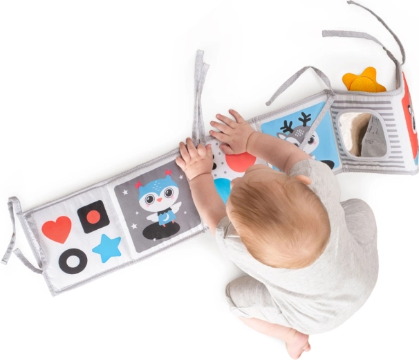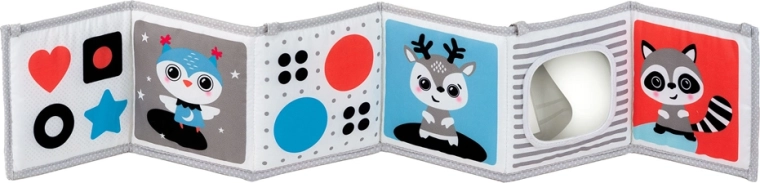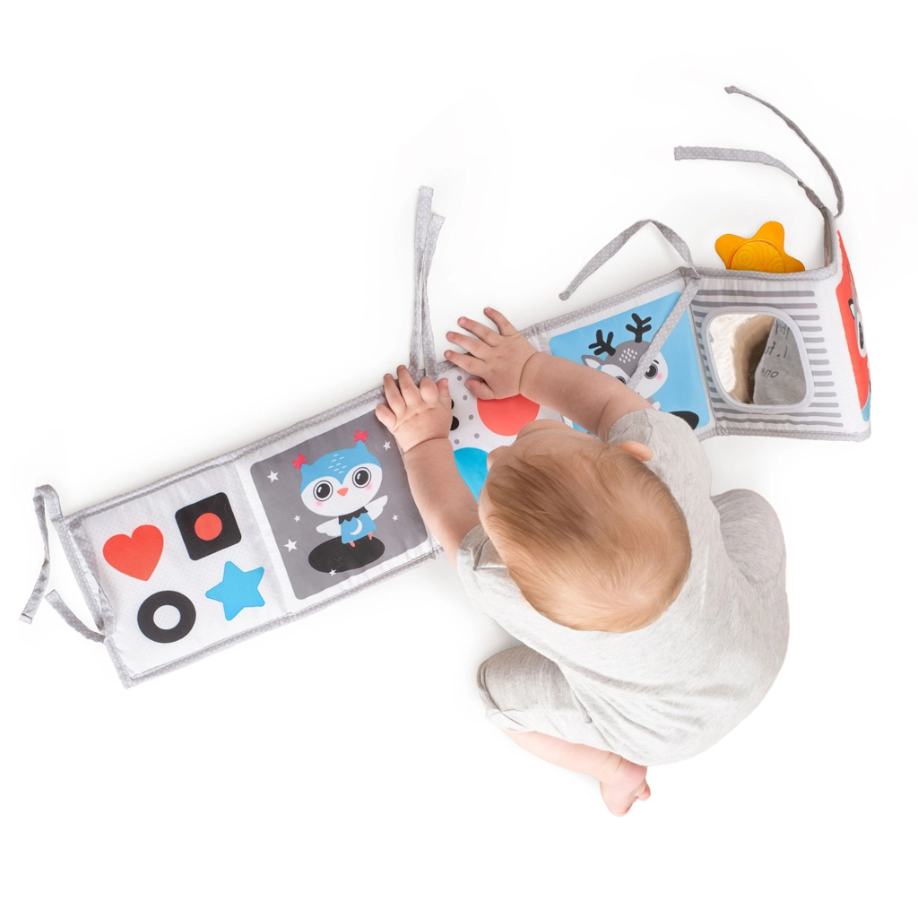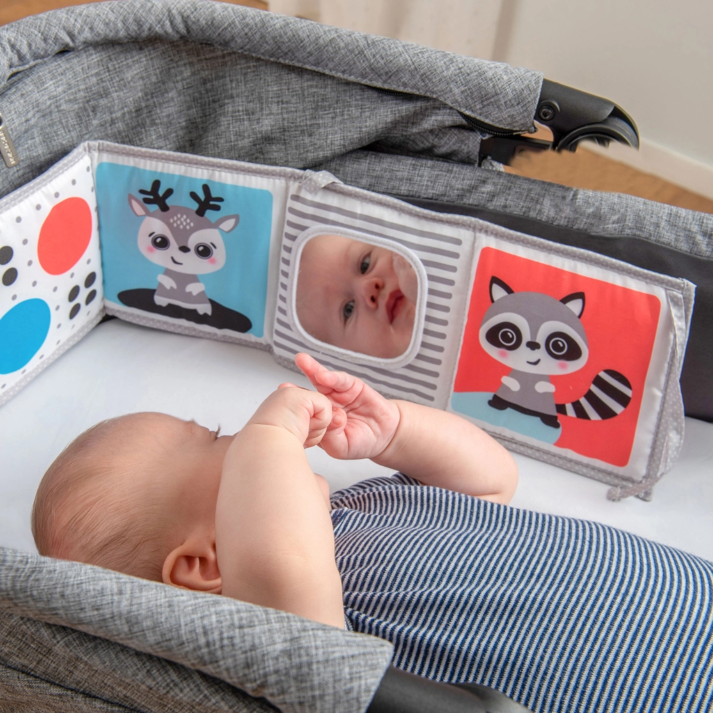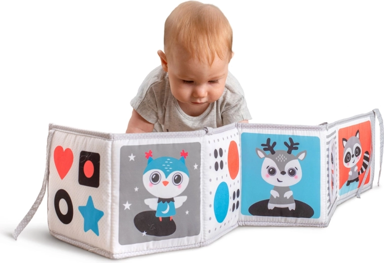Puha textil könyvecske újszülötteknek, amely támogatja a vizuális stimulációt, a hason töltött időt és az érzékszervi felfedezést. Kínál egy fekete-fehér oldalt az újszülötteknek és egy színes oldalt a későbbi fejlődési szakaszokra, nagy biztonságos tükröt, susogó és tapintható elemeket, valamint lehetőséget felállításra, laposra fektetésre vagy rögzítésre kiságyhoz vagy babakocsihoz. Könnyen összehajtható, bárhová magaddal viheted.