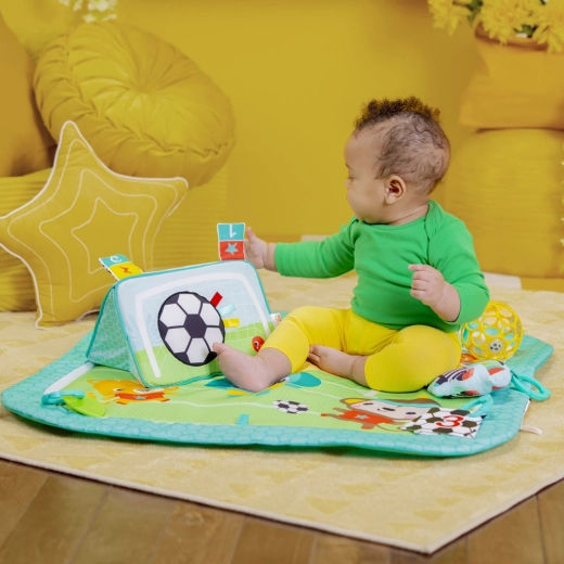 Készülj fel a szórakozásra már az első napoktól a BRIGHT STARTS Oball Grip & Kick játszószőnyeggel. 4 játékmódot kínál – hason, fekve, ülve és útközben – valamint egy interaktív panelt fényekkel, dallamokkal és hangokkal (30+), amelyek minden érintést és rúgást jutalmaznak. A puha, párnázott felület és a színes függő játékok támogatják az érzékszervi fejlődést, valamint a finom- és nagymotorikát.
