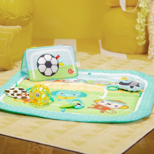 A csomag 4+ levehető játékot tartalmaz: kártyák számokkal és állatokkal, csengős plüss tukán, texturált levelek – rágóka és klasszikus, könnyen megfogható OBALL. Támogasd a kis focista első „góljait” minden nap.