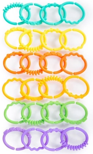 Minden karika tartós, ugyanakkor kíméletes a baba ínyéhez. A készlet 24 darabot tartalmaz élénk színekben, amelyek közül 18 erősen texturált, 6 pedig lágyított kialakítású a kényelmes rágcsálásért. Mindehhez praktikus, többször használható műanyag tasak tartozik – ideális otthonra és utazáshoz.