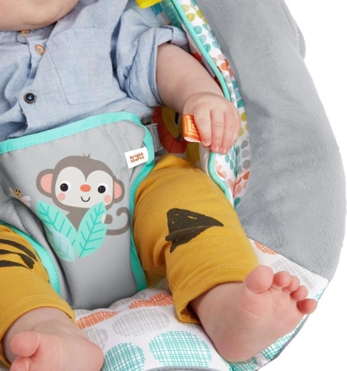 Az érzékszervi fejlődést a színes Taggies szalagok és a két aranyos függő játék szolgálja a könnyen levehető játékíven. A stabil kialakítás csúszásgátló lábakkal és 3 pontos biztonsági övvel gondoskodik a baba biztonságáról. A hinta huzata egyszerűen levehető és gépben mosható a gondtalan tisztításért.