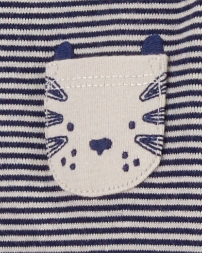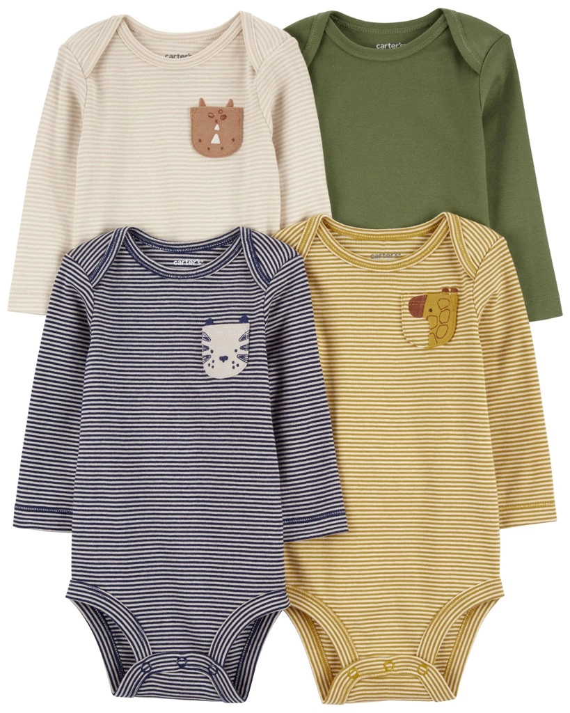 A 4 darabos, hosszú ujjú baba body szett modern tengerészkék és olív tónusokban vidám állatos motívumokkal a legkisebbek maximális kényelmére készült. A puha, légáteresztő és az érzékeny bőrhöz kíméletes 100% pamut egész napos komfortot biztosít, míg a tartós, megerősített nyakkivágás gyakori mosás után is megtartja az alakját.