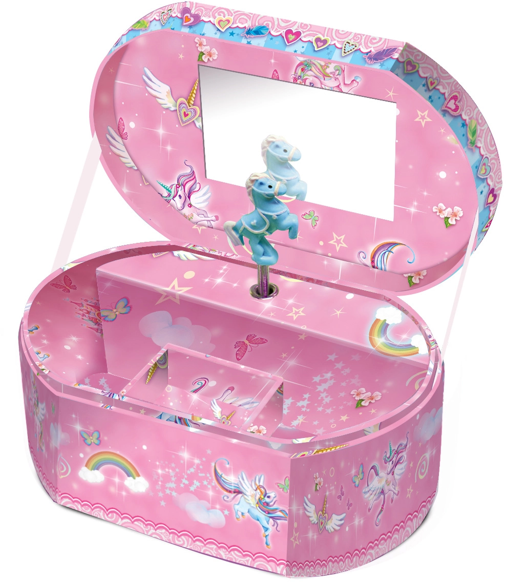 A varázslatos, ovális ékszerdoboz unikornis motívummal minden kis hercegnőt elbűvöl. Kinyitáskor gyönyörű dallamot játszik, bőséges helyet kínál fülbevalóknak, karkötőknek és apró kincseknek, és elbűvölő dísze lesz a gyerekszobának.