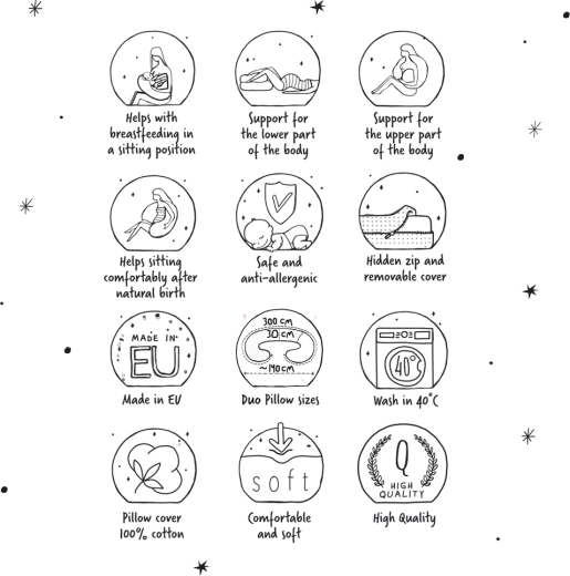 A 300 cm-es hossz kellemes „fészket” hoz létre, javítja a pozicionálást és segíti a test ellazulását. A nagy „C” betű formája megkönnyíti a megfelelő szoptatási testhelyzet megtalálását, segít csökkenteni a vállak feszültségét és támogatja a baba ergonomikus tartását.