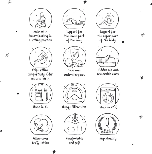 A Huggy szoptatós párnát a mindennapi kényelemre tervezték a várandósság alatt és a szülés után is. Oldalfekvésnél stabilan megtámasztja a pocakot és a hátat, szülés után pedig tehermentesíti a karokat és a hátat szoptatáskor vagy cumisüveges etetésnél. U/C alakjának köszönhetően könnyen alkalmazkodik a testalkathoz, és segít a helyes pozíció megtartásában, hogy az etetés és a pihenés természetes és kényelmes legyen.