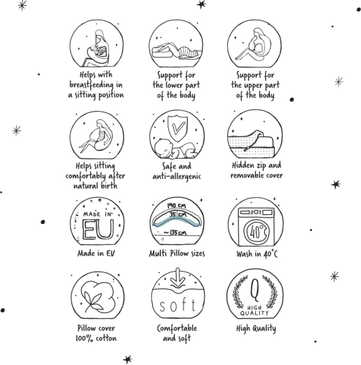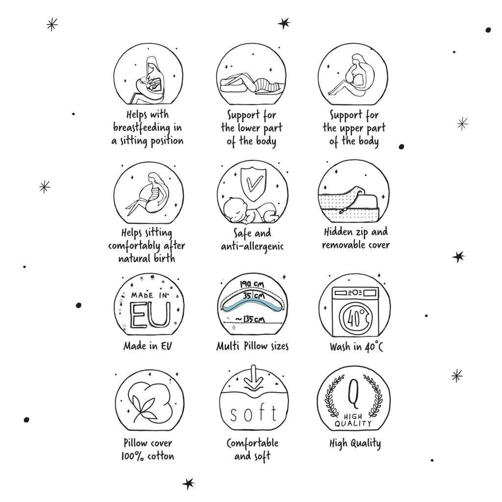 A Cebuška Multi átgondolt párna a várandósság, a gyermekágy és a szoptatás időszakára. A polisztirol mikrógyöngy (0,5–1,5 mm) töltet finoman átrendeződik a testhelyzettől függően, enyhén masszíroz, és segít a helyes háttartás fenntartásában. A puha jersey felület kellemes tapintású, és kíméletes az érzékeny anyai és bababőrhöz.