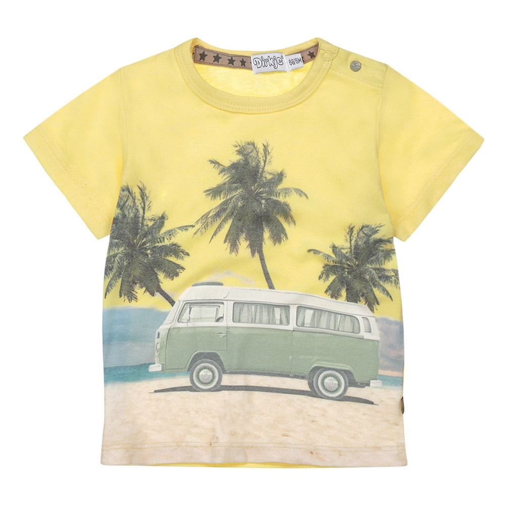 Stílusos gyerekpóló élénk sárga színben, nyári pálmafás és retro furgonos mintával a mindennapi viselet öröméért. Kínál puha és kényelmes anyagot, praktikus vállpatentos zárást az egyszerű öltöztetéshez és minőségi kidolgozást a hosszú élettartamért.
