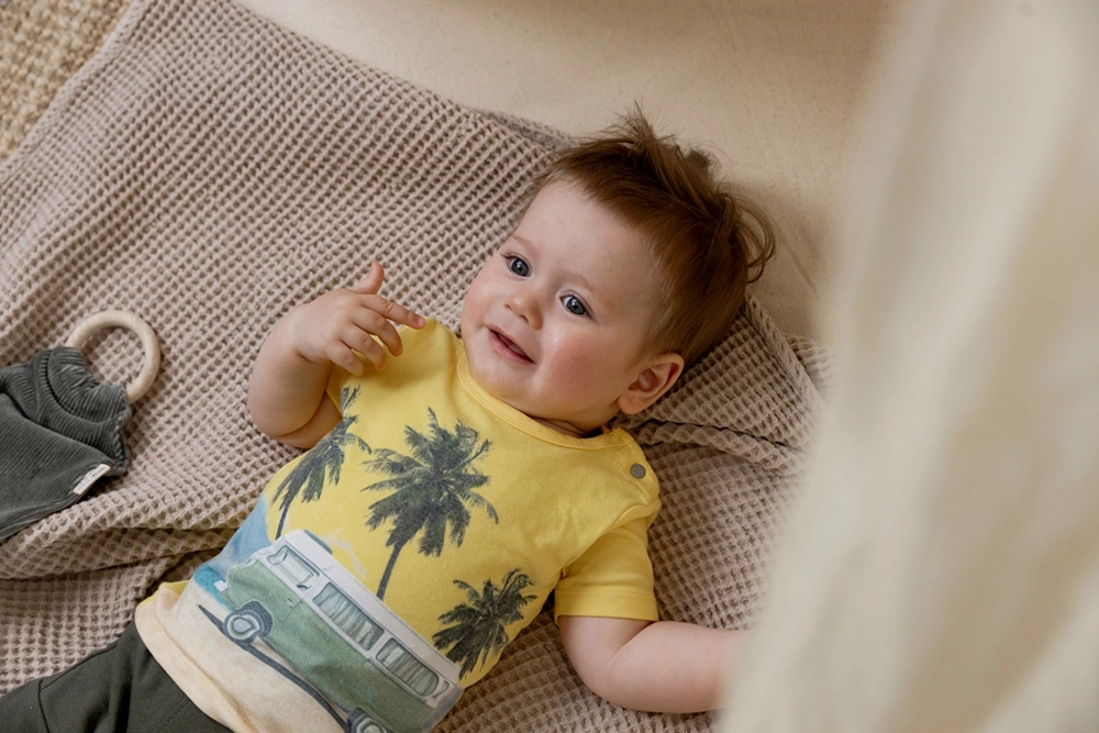 Élvezze a nyarat minden nap ezzel a könnyű és kellemes pólóval a kis kalandorok számára. A sárga árnyalat és a játékos strandos motívum friss megjelenést ad, míg a puha, elasztánnal kevert kötött anyag egész napos mozgásszabadságot és kényelmet biztosít.